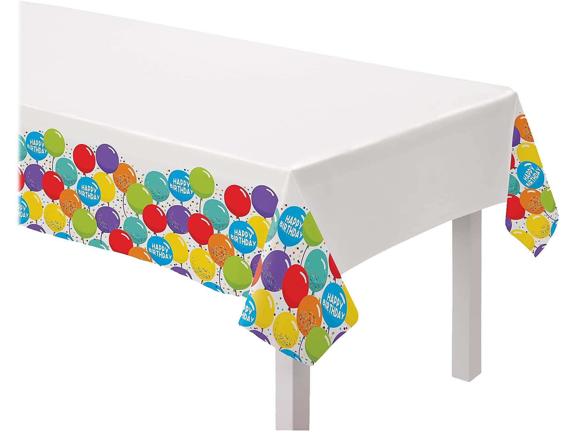 Set up a fun and colorful birthday party with this table cover. Package contains 3 pcs. plastic table cover which features solid white table color with multicolor balloon and confetti designs on its borders with the headline "Happy Birthday" on every blue balloon. Can be used in setting up birthday parties indoor and outdoor. It is very easy to clean, wipe them down to reuse them or crumble them up and toss for an easy cleanup.