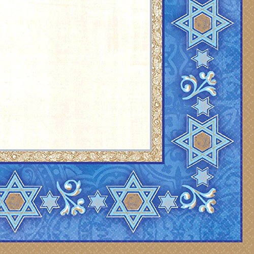 These 2 ply luncheon napkins feature a beautiful judaic pattern in ivory, blue and golden tones. Each napkin measures 12 7/8" x 12 7/8", they are sold 16 to a pack. Make your next Passover Seder a bliss with our disposable line of Judaic traditions paper goods and Star of David party supplies.