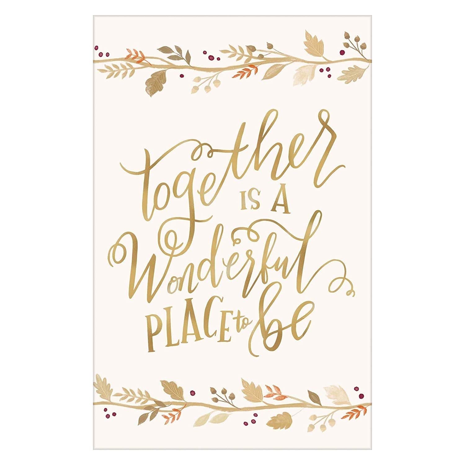 A together is a wonderful place table cover sets the foundation for a memorable Holiday feast! This paper table cover features the headline "together is a wonderful place to be" In gold script font and a trim of fall berries and twigs. It is the perfect setting for a Thanksgiving or fall-time celebration.