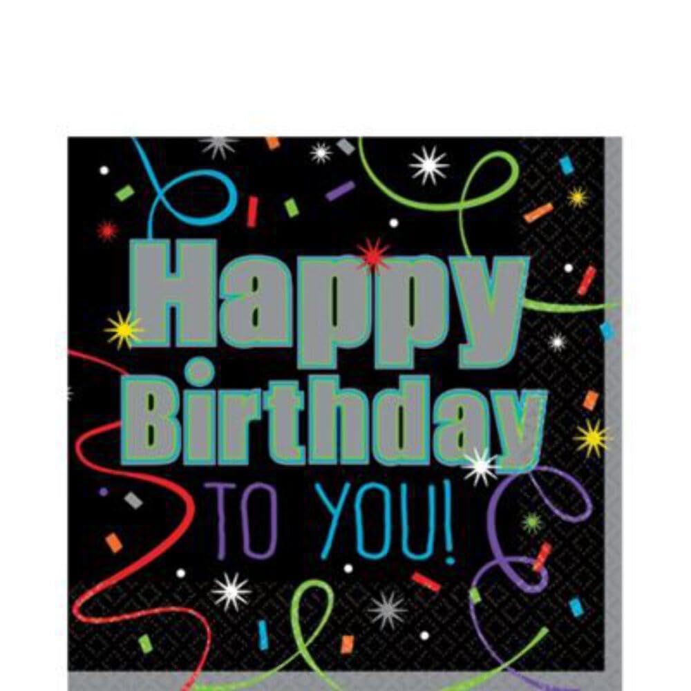 Celebrate YOU with our Brilliant Birthday Luncheon Napkins! Featuring a black background with a grey border and colorful printed confetti! Napkins read "Happy Birthday To You! " in grey and neon print. Each napkin measures 6. 5" x 6. 5". Includes 16 - 2 ply paper napkins per package.