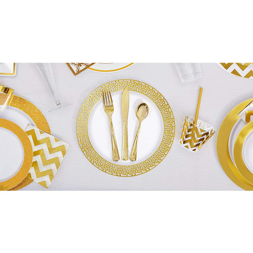 Have yourself a plate that wins all occasion with the help of these premium plastic dinner plates. These standard size heavy-duty plates Measures 7 1/2'' And comes in white with a metallic gold trim in an openwork pattern. With its elegant glossy finish these plate definitely captures the look of a fine China. Each pack comes with 20 pieces of plastic plates that lets you achieve an elegant table setting at a fraction of a cost.
