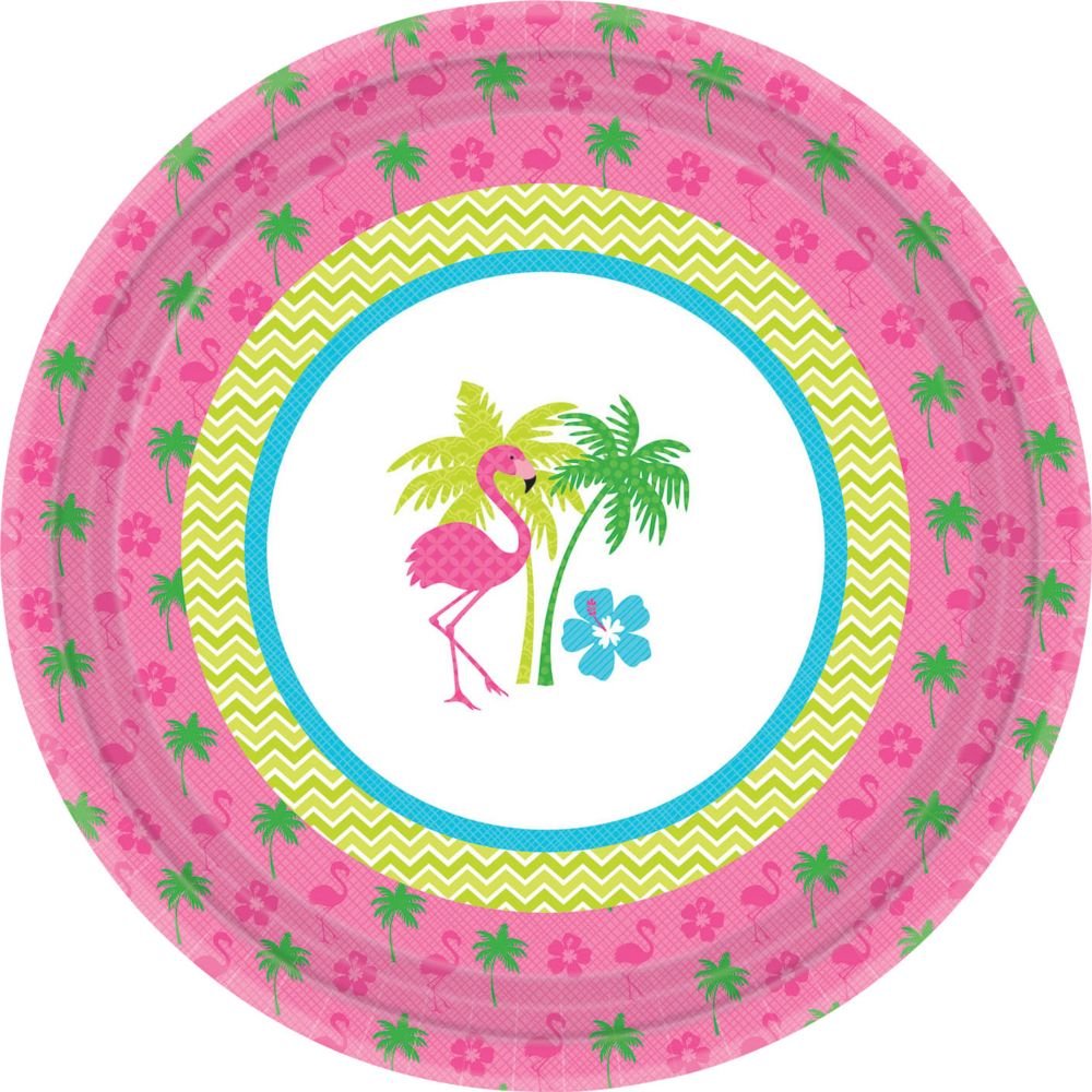 Coming eight to a pack, these Flamingo Fun Luncheon Plates are the perfect size for mealtime at your party. Each 10.5 plate features a pink flamingo standing in front of two palm trees. The plates themselves are pink, green, and white.