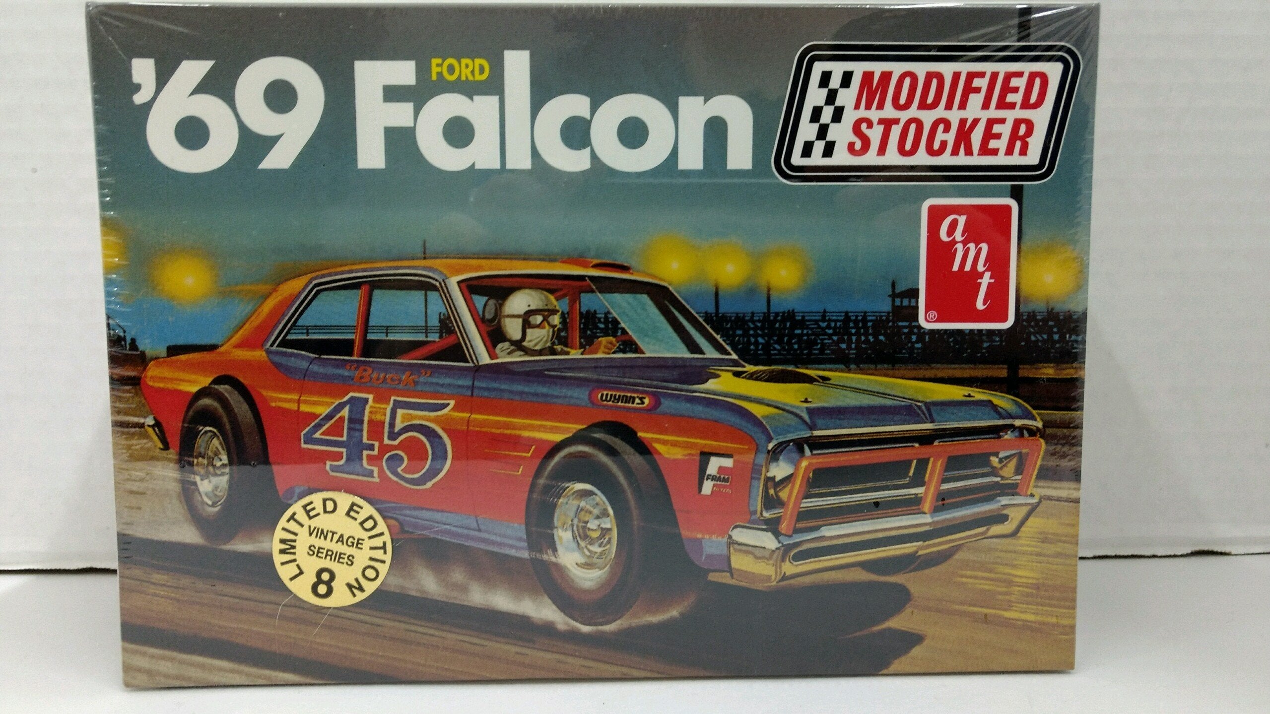 AMT 30142 1969 Ford Falcon Modified Stocker. 1:25 Scale Plastic Model Kit. Requires Assembly. Vintage Series #8 - Limited Edition. Padded Roll Cage. Super-Wide Goodyear Vinyl Asphalt Slicks. Optional Short-Track Front Tire. Front Bumper Brace. Bucket Seat. 351 Ford Engine. Exhaust Dumps. Produced in 1999. Glue and paint needed for assembly, but NOT included. Ages 14 and up