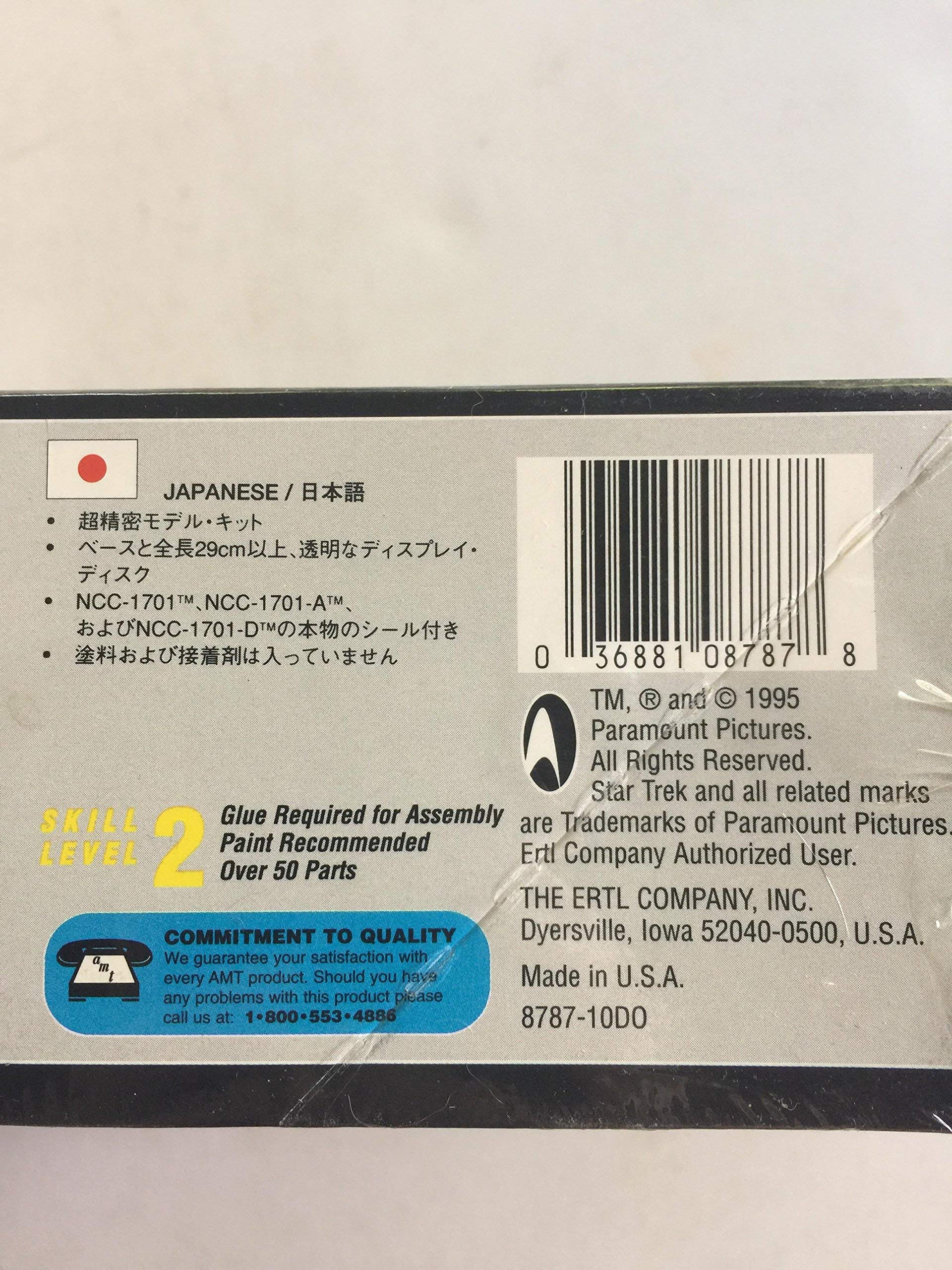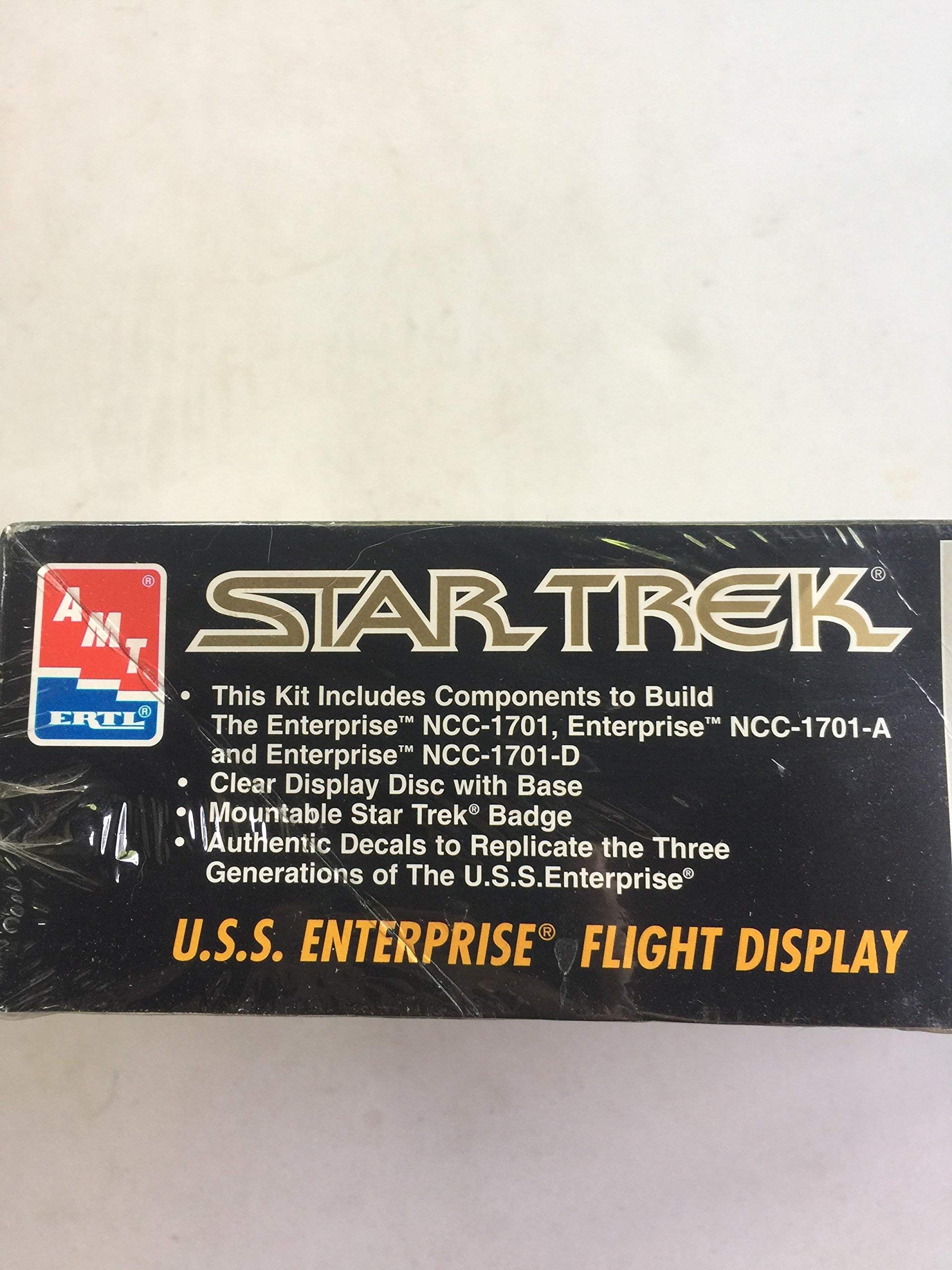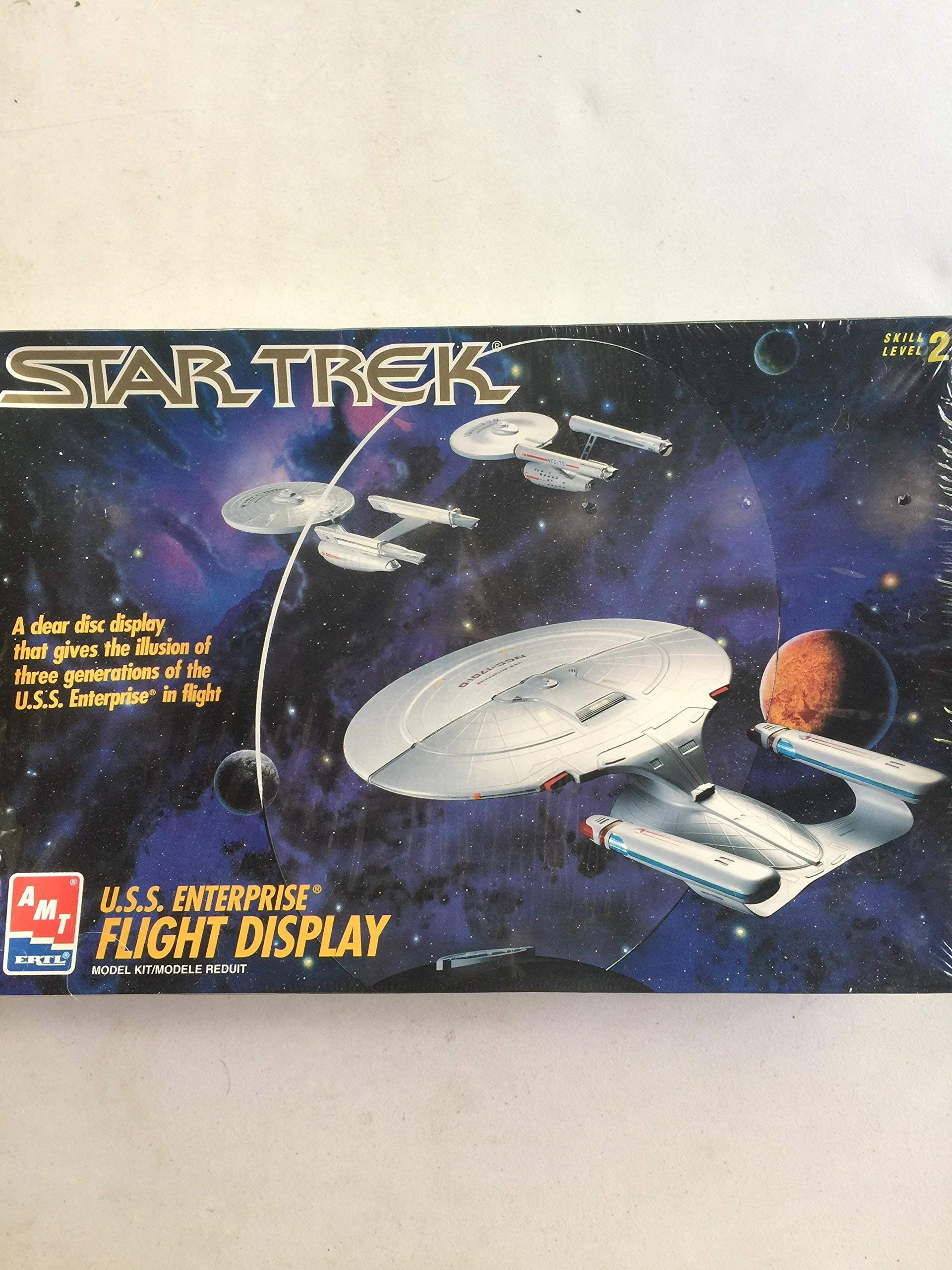 A clear disc display that gives the illusion of 3 generations of the USS Enterprise in flight.