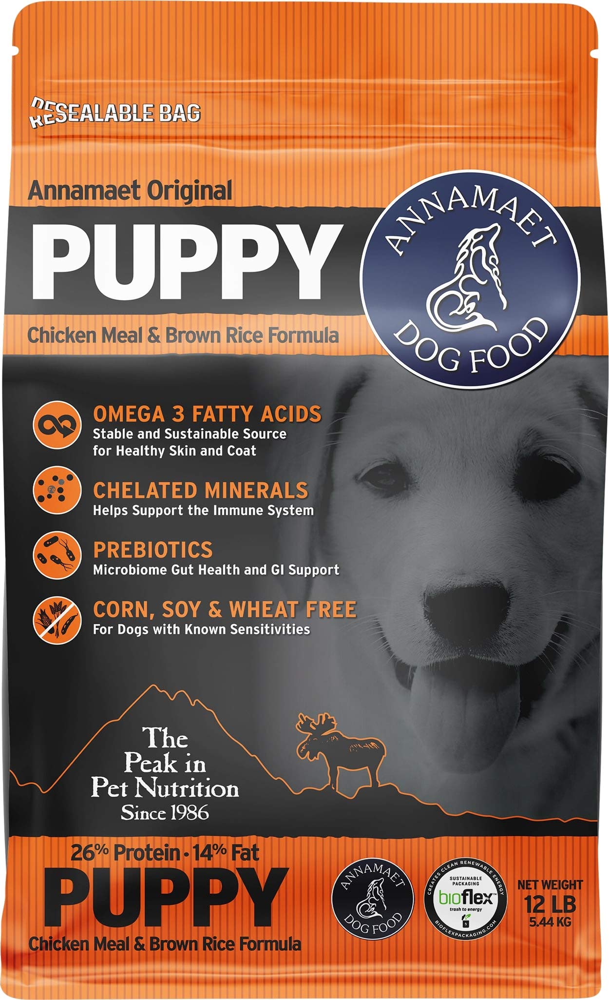 Annamaet Original Puppy will compliment our original line of products as it is formulated with chicken meal and brown rice. It is corn, soy, and wheat free and also fortified with a stable, sustainable source of DHA. This major Omega 3 Fatty Acid is long known to enhance brain development in puppies. Annamae's Original Puppy formula is highly palatable with optimum levels of calcium for proper growth. With its mid range levels of protein and fat, this will be a great diet for puppies of all sizes, including large and giant breed puppies.