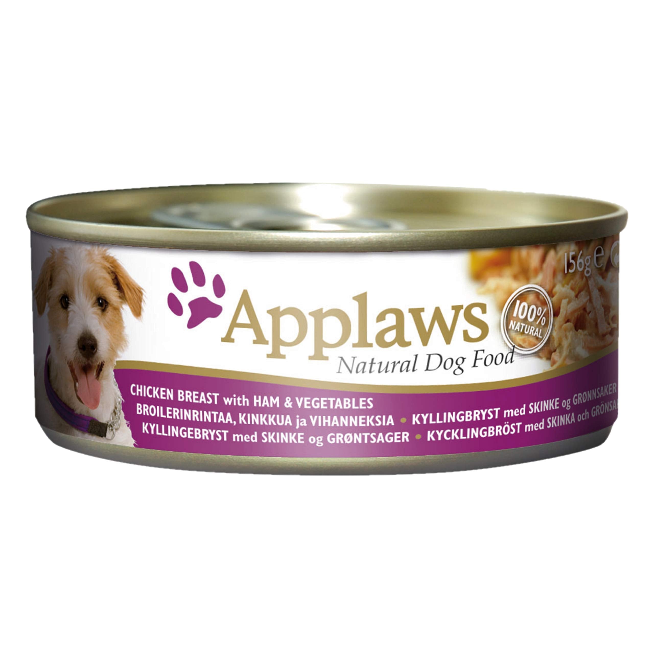 Applaws Adult Dog Food Tins with Chicken, Ham and Vegetables 156gm is a complimentary premium dog food made from 100% natural ingredients for a delicious taste your dog will love. Containing 28% chicken and 15% ham, it is completely additive free for a wholesome goodness derived from nature. The Chicken used in this product are fed only organic feed and are entirely hormone free. The recipes have been created for cats to enjoy and to build health