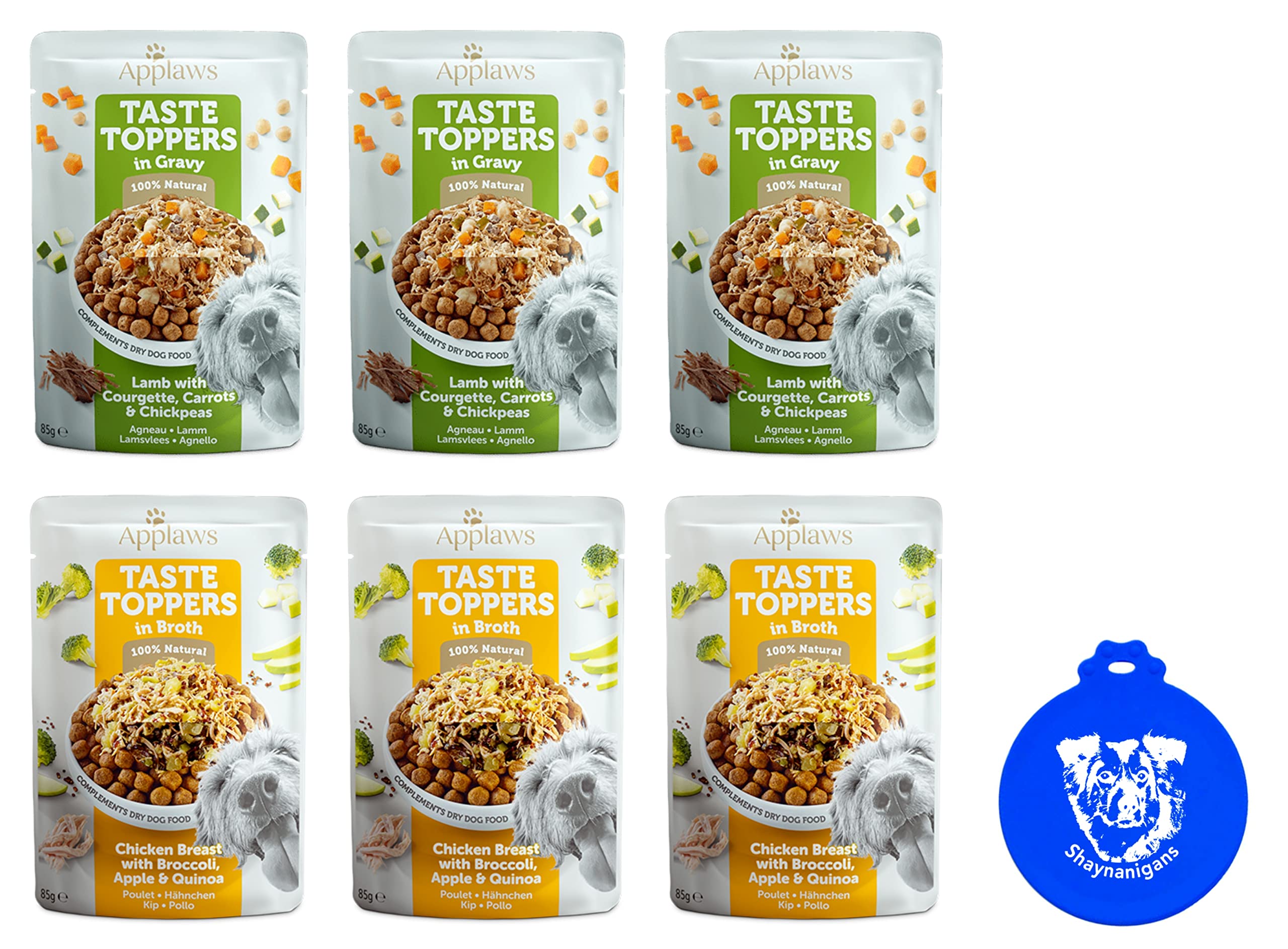 Applaws Taste Toppers Wet Dog Food Bundle: (3) Chicken Breast With Broccoli, Apple, Quinoa in Broth & (3) Lamb With Zucchini, Carrot & Chickpeas in Gravy (6 Pouches Total, 3 Oz Each) Plus Silicone Lid