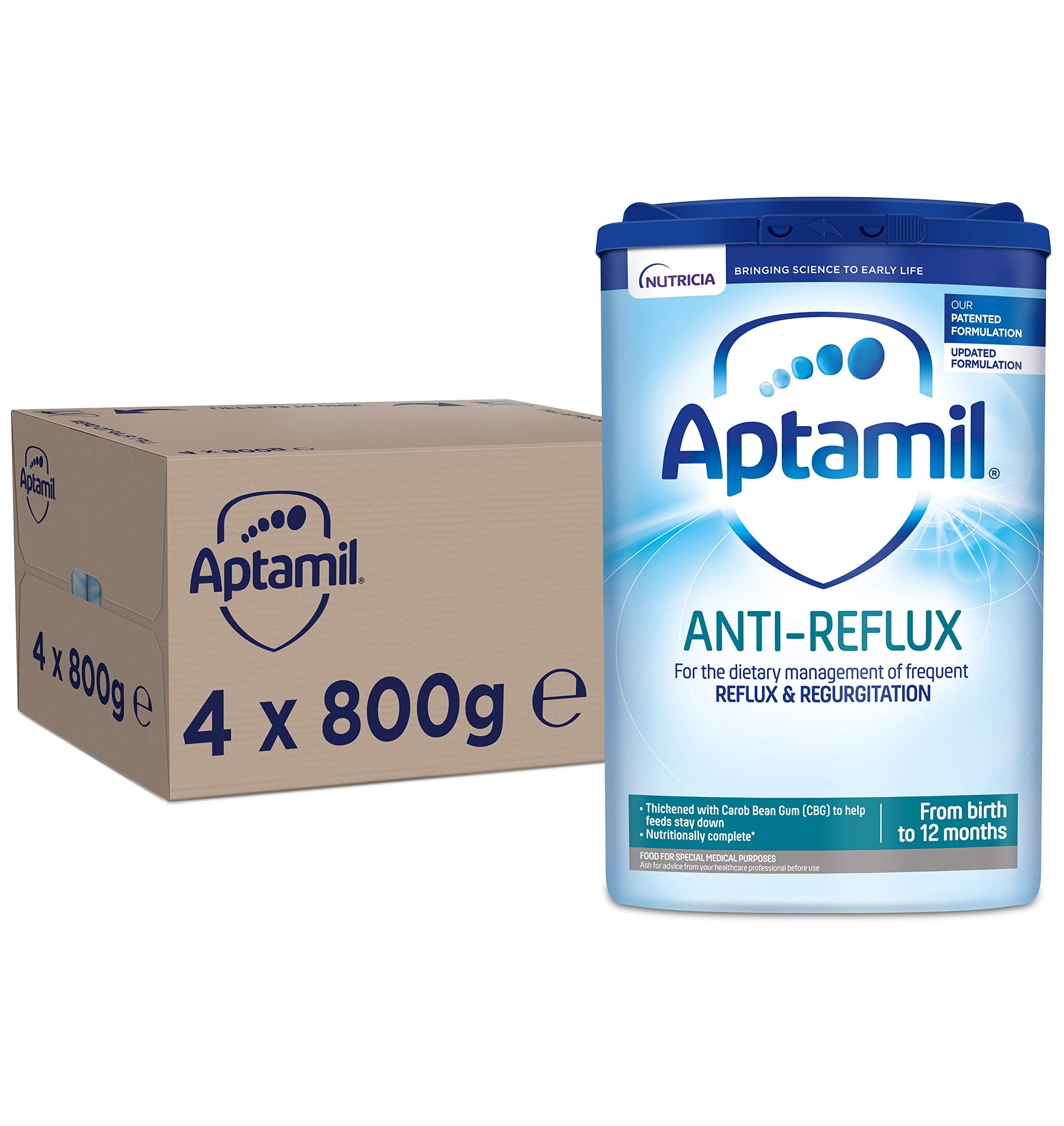 DescriptionProduct DescriptionAptamil Anti - Reflux From Birth 800gIngredientsDairy-based blend (of which 28% is fermented) [Lactose (from MILK), Vegetable oils (Palm oil, Coconut oil, Rapeseed oil, Sunflower oil, High oleic sunflower oil), Skimmed MILK, Demineralised whey (from MILK), Whey concentrate (from MILK), Calcium phosphate, FISH OIL, Choline chloride, Potassium citrate, Sodium citrate, Potassium chloride, Vitamin C, Magnesium chloride, Emulsifier (SOY lecithin), Inositol, Calcium carbonate, L-Carnitine, Vitamin E, Antioxidant (Ascorbyl palmitate), Pantothenic acid, Nicotinamide, Thiamin, Vitamin B6, Riboflavin, Folic acid, Potassium iodide, Vitamin K1, Biotin, Vitamin B12], Galacto-oligosaccharides (GOS) (from ILK), Thickener (Carob bean gum), Whey protein (from MILK), Fructo-oligosaccharides (FOS), Oil from Mortierella Alpina, Taurine, Ferrous sulphate, L-Tryptophan, Zinc sulphate, Uridine 5'-monophosphate sodium salt, Cytidine 5'-monophosphate, Adenosine 5'-monophosphate, Inosine 5'-monophosphate sodium salt, Guanosine 5'-monophosphate sodium salt, Copper sulphate, Vitamin E, Vitamin A, Manganese sulphate, Sodium selenite, Vitamin D3.DirectionsFeeding GuideAptamil® Anti-Reflux is a thickened feed.We recommend using a single hole fast flow teat.Feeding GuideApprox. age: Birth, Approx. weight 3.5kg, 7 3/4lb, No. of level scoops per feed (1 scoop = 4.5g): 3, Quantity of water per feed 90ml, 3fl oz, No. of feeds per 24 hours: 6Approx. age: 2 weeks, Approx. weight 3.9kg, 8 1/2lb, No. of level scoops per feed (1 scoop = 4.5g): 4, Quantity of water per feed 120ml, 4fl oz, No. of feeds per 24 hours: 6Approx. age: 2 months, Approx. weight 5kg, 11lb, No. of level scoops per feed (1 scoop = 4.5g): 6, Quantity of water per feed 180ml, 6fl oz, No. of feeds per 24 hours: 5Approx. age: 4 months, Approx. weight 6.5kg, 14 1/2lb, No. of level scoops per feed (1 scoop = 4.5g): 7, Quantity of water per feed 210ml, 7fl oz, No. of feeds per 24 hours: 5Approx. age: 6 months**, Approx. weight 7.5kg, 16 1/2lb, No. of level scoops per feed (1 scoop = 4.5g): 7, Quantity of water per feed 210ml, 7fl oz, No. of feeds per 24 hours: 5Approx. age: 7-12 months, Approx. weight - kg, - lb, No. of level scoops per feed (1 scoop = 4.5g): 7, Quantity of water per feed 210ml, 7fl oz, No. of feeds per 24 hours: 3**Assumes weaning at 6 months.Your baby may need more or less than the feeding guide above. This information is given as a guide only. Consult your healthcare professional if you require more advice.Important: Always use the scoop provided, please note the colour of the scoop in this pack may change from time to time.How to use this packTo open, remove tamper evidence strip on the rim of pack.There is a handy leveller built into the pack. Store your scoop in the lid so that it is kept safe and secure.Click the lid securely shut to keep your powder fresh.Preparing your baby's feedBecause powdered milks are not sterile, failure to follow instructions may make your baby ill.1 Wash hands and sterilise all utensils according to manufacturers' instructions.2 Boil 1 litre of freshly run water. Leave kettle to cool for 45 minutes and no longer. Measure the required amount of water (refer to feeding guide) into a sterilised bottle. Be careful of scalding. Do not use artificially softened or repeatedly boiled water.3 Using the scoop provided level off the powder with the built-in leveller. Do not press/heap the powder.4 Add the correct measure of powder to the water. Adding too many or too few scoops can be harmful. Place the sterilised teat and cap on the bottle. Hold the bottle horizontally and shake from left to right for 10 seconds, then hold it vertically and shake from top to bottom for 10 seconds. The time between adding the scoops and shaking the bottle should be as short as possible.5 Leave the bottle to stand for 5 minutes to allow it to thicken. Turn the bottle upside down just before feeding. Check temperat