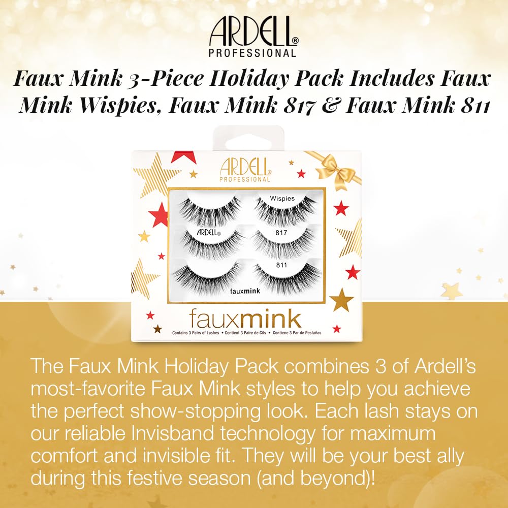 3 of Ardell's Top Selling Faux Mink eyeashes all wrapped with a bow for the Holidays! Ardell Faux Mink 3 Piece Gift Set Includes Faux Mink Wispies, Faux Mink 817 and Faux Mink 811
