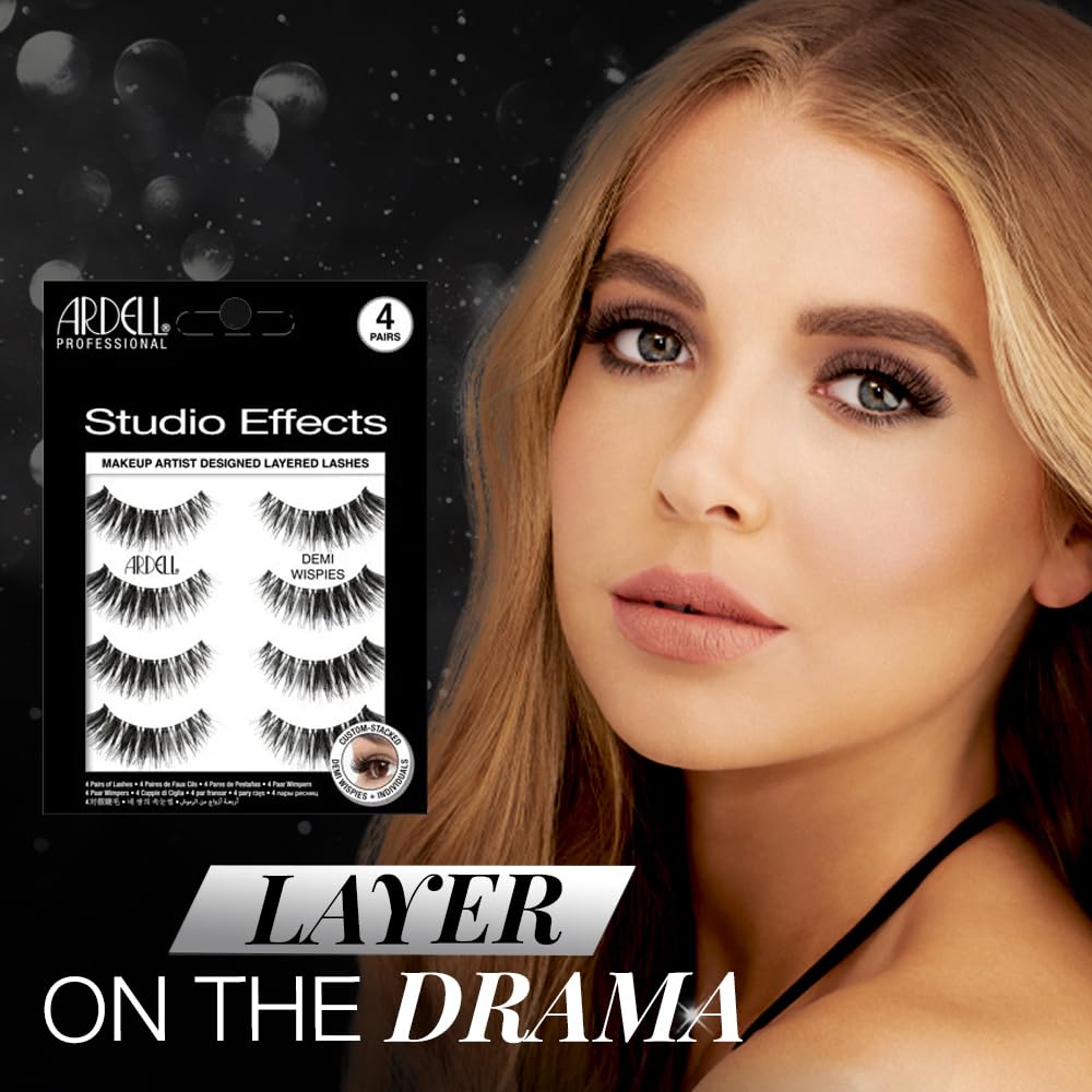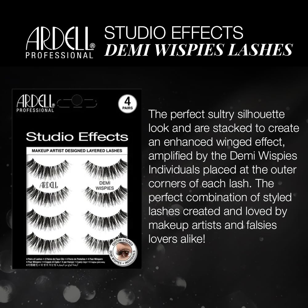 This makeup artist's sultry silhouette look is stacked to create an enhanced winged effect, amplified by the Demi Wispies Individuals placed at the outer corners of the lash. A perfect combination of styled lashes created and loved by makeup artists and falsies lovers! Long, Black Fibers: These lashes are fashion perfection. Designed with long intense black fibers that are slightly dispersed creating just the right amount of flirty and sassy. This is the perfect lash set for anyone who wants to add length to their natural lashes without it looking stiff or bulky. Perfectly arranged to elongate the eye and can be worn with your everyday look, or amped up for date night. Bold, Full Volume: Ready to turn up the volume on your look? With these intense black fibers, you can achieve that smokey, get-noticed style without looking awkward or stiff. They blend seamlessly with your natural lashes while staying stylish and fabulous. And with a filled-in black liner and deliciously dark and dense lashes, you’ll be ready to take center stage. Flared, Winged Style: Now, you don't have to worry about faux lash bloopers. Ardell’s patented Invisiband® lash band technology means you get to enjoy a seamless, comfortable fit like never before! The invisible lash band blends so well into the natural lash line that you can wear them bare-faced or with a full face of makeup. Get out there and seize the day with overflowing confidence!
