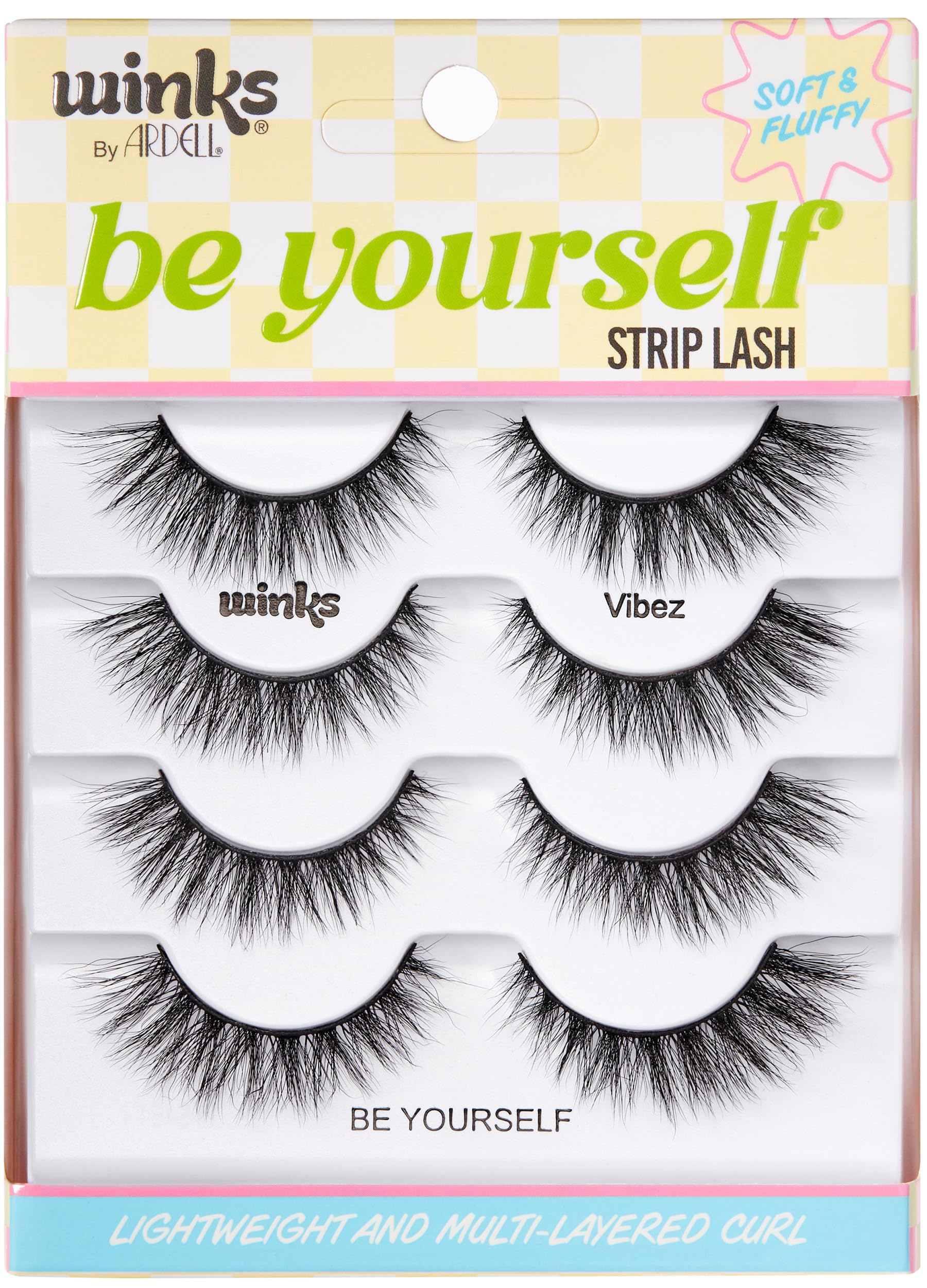 Ardell Winks Be yourself Wish Vibez, 4 pairs Step into the spotlight with Ardell Winks Be Yourself Lashes Vibez. These black strip lashes are designed for those who desire a bold and expressive look. The dense fibers provide high volume for a fuller, more dramatic lash line, while their soft and lightweight construction ensures comfortable wear throughout the day. Easy to apply, these lashes are perfect for anyone looking to make a statement, whether it's for a night out, a special event, or just to add a touch of drama to their daily look.