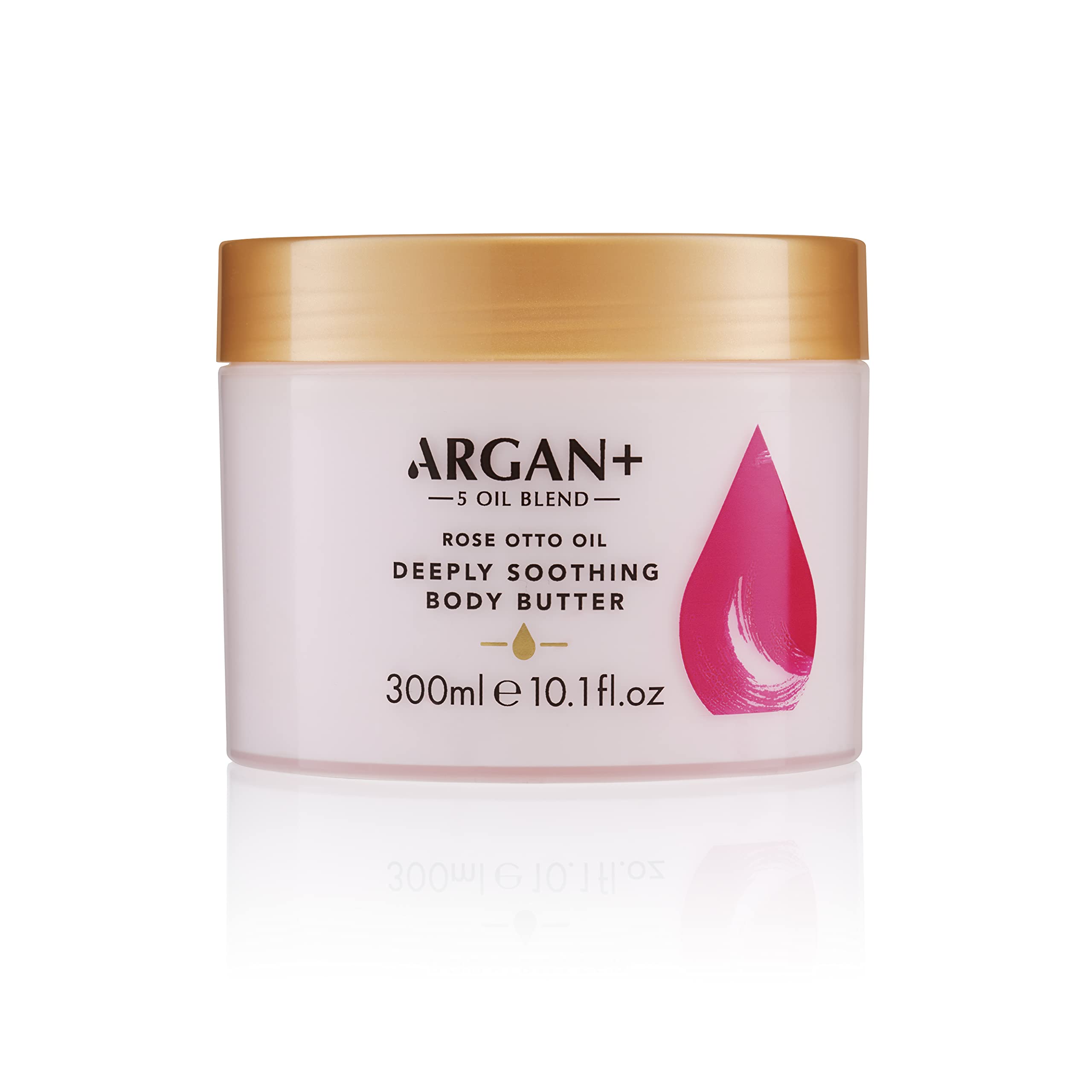 Product DescriptionDeeply Soothing Body Butter from Argan+, 300mlCalm dry skin with the Deeply Soothing Body Butter from Argan+. Enriched with our signature 5 Oil Blend and luscious Rose Otto Oil and hibiscus, you can enjoy buttery soft skin that smells delicious in a matter of minutes. The indulgent formula combines 4 natural oils with precious Moroccan Argan Oil to provide skin with long-lasting hydration with every use.The Argan+ 5 Oil Blend is a revolutionary formula of five natural oils, each rich in nutrients that contribute to skin health, chosen for their nourishing and restorative properties. Our Moroccan Argan Oil, Baobab, Kukui, Moringa and Sacha Inchi Oil blend is bursting with natural goodness, delivering natural antioxidants, vitamins, Omega 3, 6 and 9, plus essential fatty acids Linoleic and Linolenic acid to rejuvenate.This thick and creamy skin lotion delivers the ultimate hydration treatment and full-body replenishment in one, locking in moisture so you can enjoy silky-smooth skin every day. With a delicate floral fragrance and lightweight texture, Argan+ luxury body balm slowly melts into skin, leaving it glowing and smelling delicious.Our indulgent body butter is not only good for your skin, but it’s good for the planet, too. The Argan+ Deeply Soothing Body Butter is created with vegan-friendly ingredients, and the tub is 100% recyclable when you’re done. Enjoy eco-conscious skincare products that deliver beautiful results without compromise.A little goes a long way. To enrich skin, massage a generous amount over dry skin after bathing or showering, concentrating on areas prone to dryness such as knees, ankles, and elbows. For the complete at-home spa experience, use after applying Argan+ Ultra Gentle Body Wash.Perfect for treating yourself or gifting to a loved one in need of some TLC. Discover the full range of Argan+ Rose Otto Oil bath and body products. Mix and match your favourite beauty essentials, from hair care, washing and bathing to skincare collections - Argan+ specialises in indulgent formulations and high-quality ingredients that add a little luxury into your everyday routine.IngredientsAqua (Water), Cocos Nucifera (Coconut) Oil, Cetearyl Alcohol, Glycerin, Glyceryl Stearate, Polyglyceryl-3 Dicitrate/Stearate, Sodium Polyacrylate, Rosa Canina Fruit Oil, Phenoxyethanol, Parfum (Fragrance), Argania Spinosa Kernel Oil, Sodium Stearoyl Glutamate, Rosa Damascena Flower Water, 2-Bromo-2-Nitropropane-1,3-Diol, Ethylhexylglycerin, Adansonia Digitata Seed Oil, Aleurites Moluccana Seed Oil, Moringa Oleifera Seed Oil, Plukenetia Volubilis Seed Oil, Cananga Odorata Flower Extract, Rosa Damascena Extract, Hibiscus Sabdariffa Flower Extract, Kigelia Africana Fruit Extract, Cistus Ladaniferus Oil, Ferula Galbaniflua (Galbanum) Resin Oil, Rosa Damascena Extract, Adansonia Digitata Fruit Extract, Citric Acid, Dehydroacetic Acid, Citronellol, Benzyl Salicylate, Alpha-Isomethyl lonone, Cinnamyl Alcohol, Eugenol, CI 14700 (Red 4)Manufacturer Contact InformationMade for: Argan+ Brand Architekts Ltd, PO Box 443, Teddington, TW11 1AT, England. UK RP. MSL, BL9 5NB, UK. EU RP. MSL, Suite 5385, 27 Upper Pembroke St, Dublin, IE.