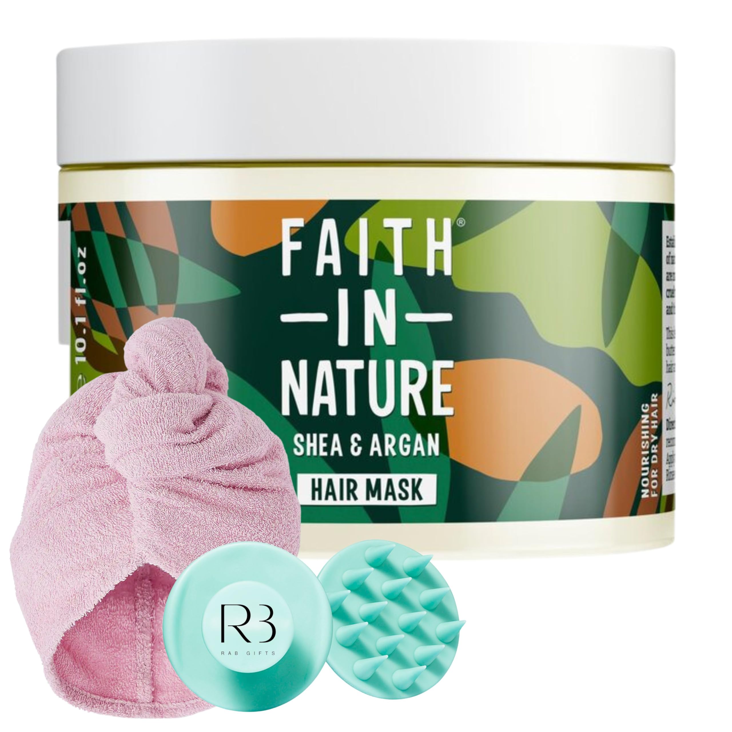 Argan Oil Hair Mask Bundle With Faith in Nature Shea & Argan Hair Mask 300ml and Rab Gifts Hair Wrap and Massage Brush