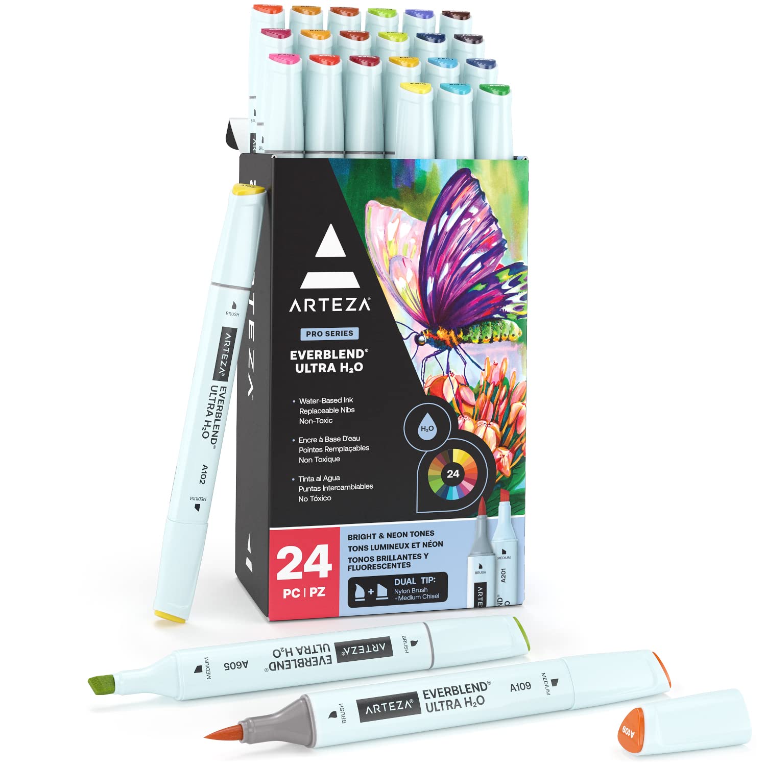 ARTEZA Dual Tip Brush Pens, 24 Bright and Neon Tones, EverBlend Watercolor Calligraphy Markers with Nylon Brush