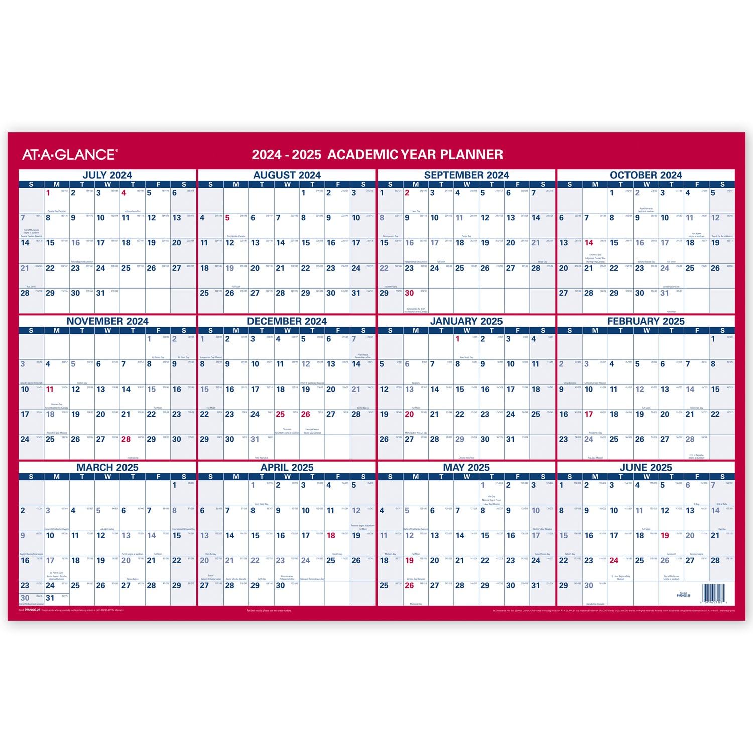 AT-A-GLANCE Horizontal Erasable Academic Wall Calendar features a convenient reversible layout that allows you to choose how you plan. Covers 12 months from July 2024 - June 2025 on one side and January 2025 - December 2025 with Julian dates. Large, yearly display lets you view all 12 months in an instant. Regular year side is blue and the academic year side is red. Erasable write-on/wipe-off surface lets you quickly revise plans. Simply wipe the calendar clean with a damp cloth and start over. Wet-erase marker included. Unruled daily blocks provide plenty of writing space for notes and reminders. 36" x 24" size is perfect for solo or shared usage. Daily blocks measure 1-1/4" x 1-3/16". Bold, large print allows for easier viewing and reading. Thoughtfully designed and assembled in the U.S. using high-quality materials.