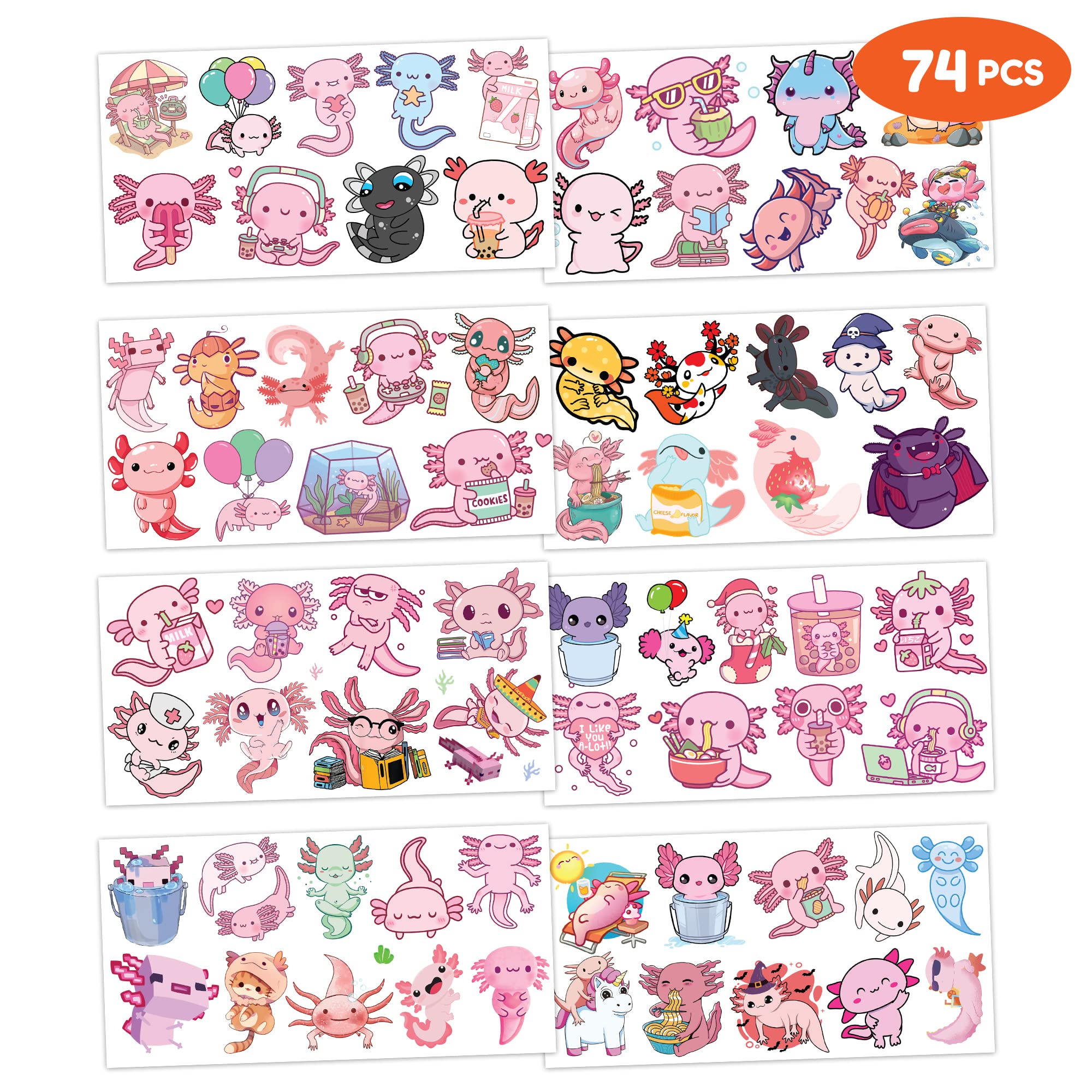 Axolotl Temporary Tattoos Stickers - 8 Sheets 74pcs | Super Cute Party Favors for Kids | Ideal Birthday Party Decorations and Classroom Prizes Safe and Fun Fake Tattoos | Perfect Gifts for Boys Girls