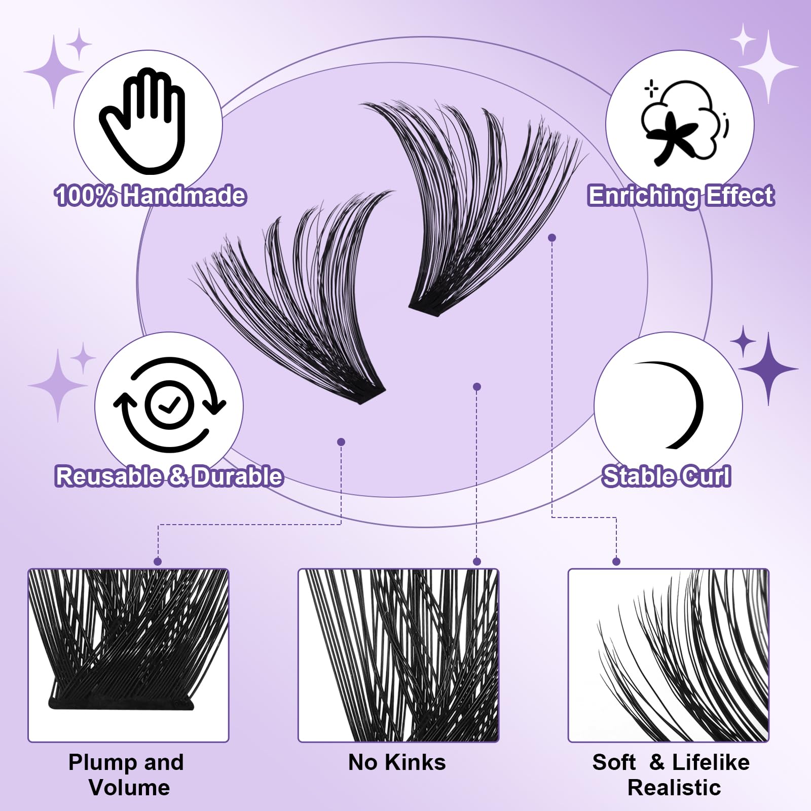 The 70D + 90D individual lashes includes 280 individual lash clusters. The DIY lash clusters which have luxury layers and looks like more realistic and fluffy. And 70D + 90D design gives you a salon effect but DIY at home by yourself. We offered mixed lengths from 9 to 16mm.