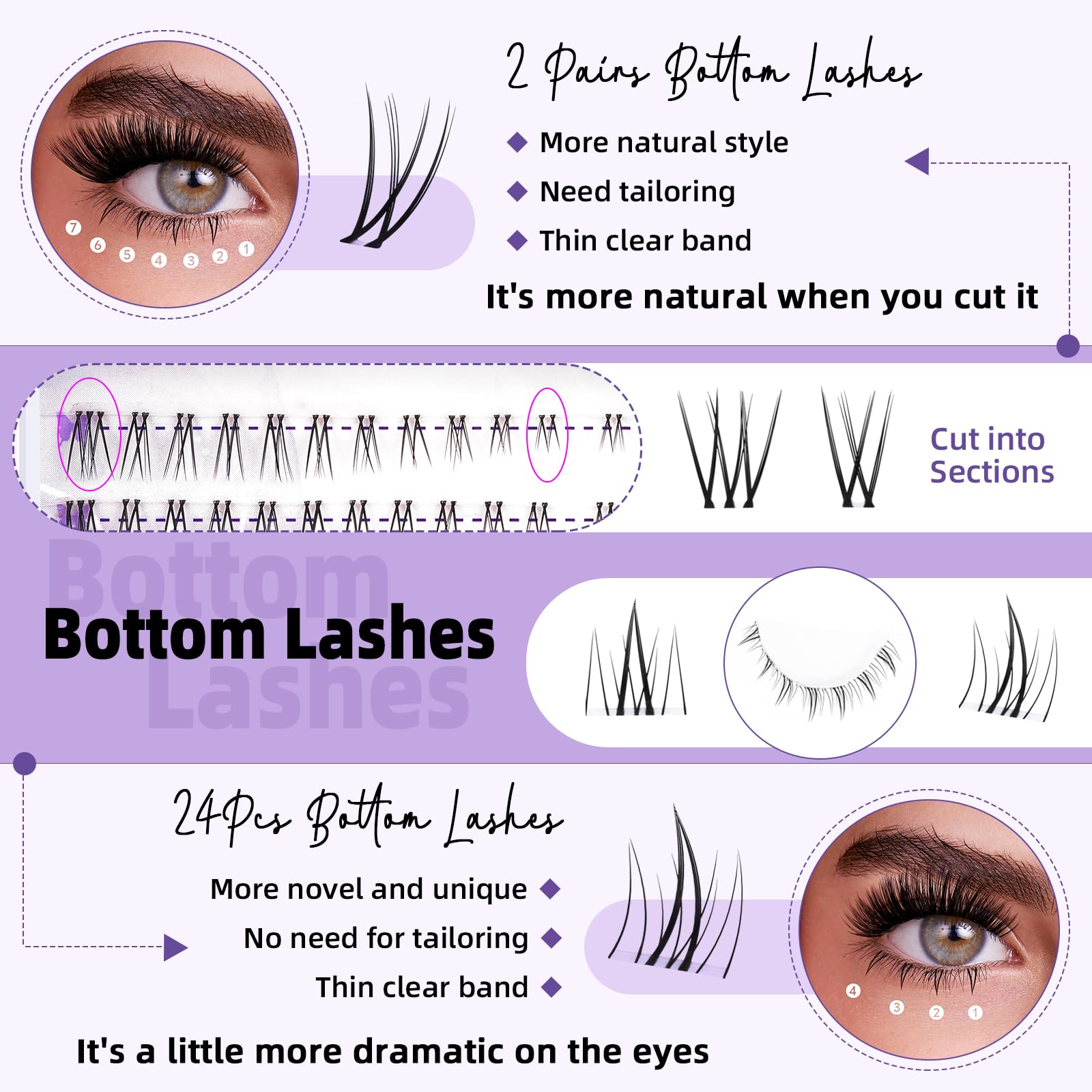 Why we introduced this combination? For beauty enthusiasts, a complete makeup look takes many details to put together. We believe that although the presence of bottom lashes extensions alone makes the eyes look colorful, it would be even more effective to have lower lashes added to the mix. The lash clusters wispy has black reusable lash band and super soft tapered tips. The lash band blend with born lashes quickly and perfectly. The lash tips give 0 burden for your eyes. And the under eyelash extensions has transparent lash band which undetectable on your eyes. Lash beginners also can't miss this lash tray, which will make you fall in love at first glance! Experience vertical eye enlargement! The combination of upper and lower lashes enlarges the eyes vertically.