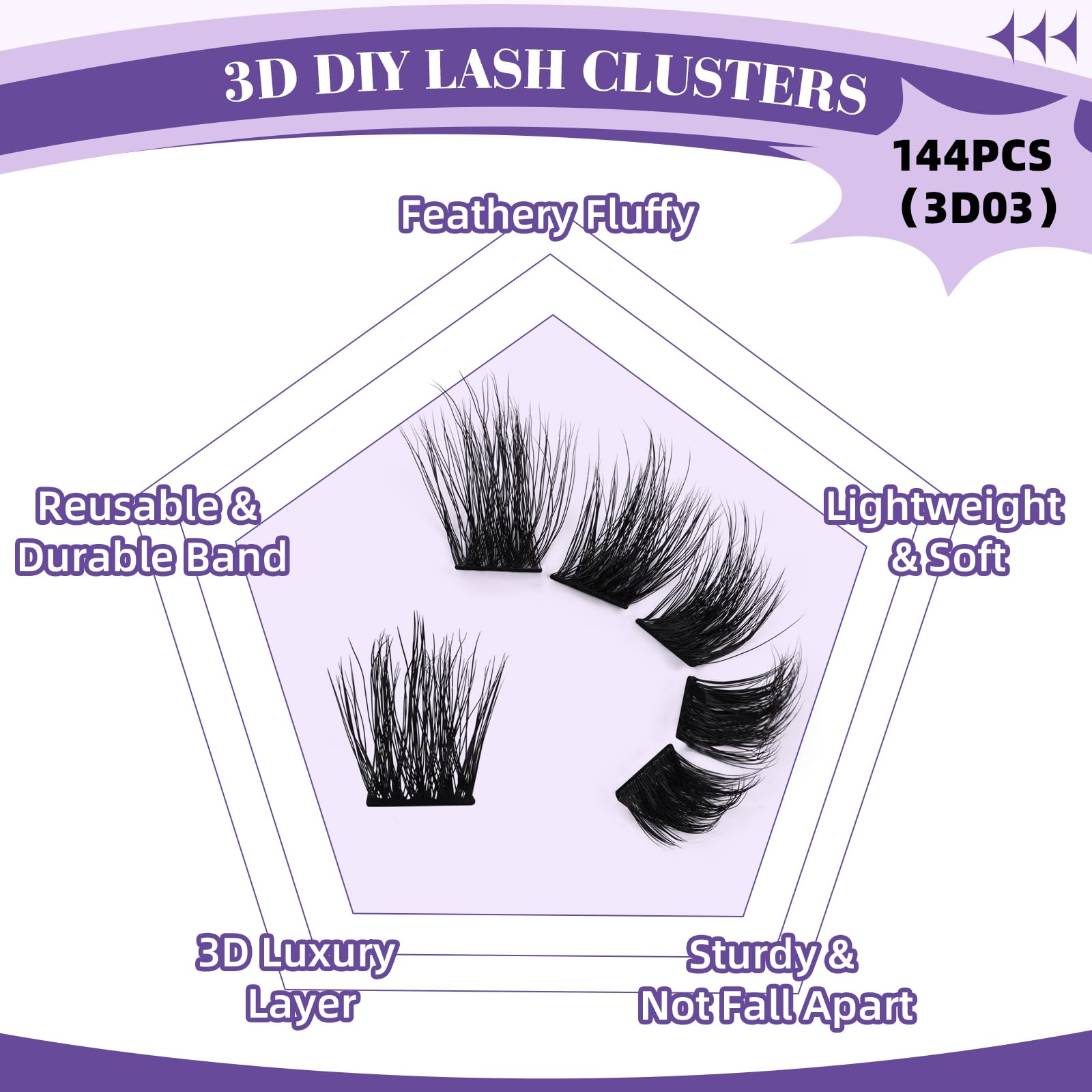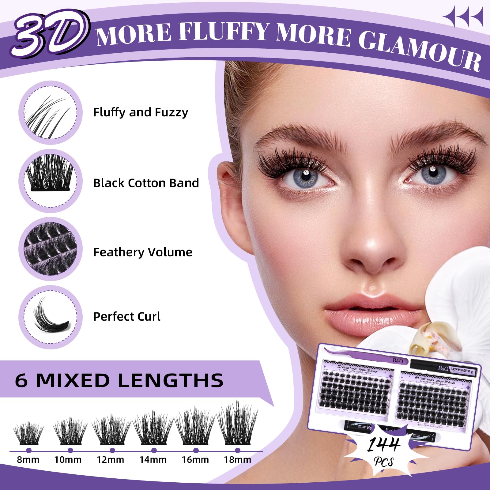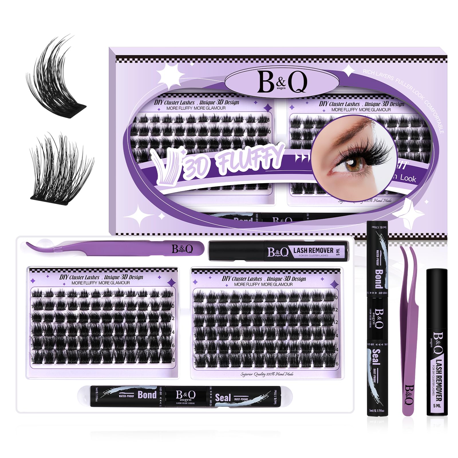 The 3D lash extension kit includes 144 lash clusters, lash bond and seal,lash remover, eyelash applicator tool. The DIY eyelash clusters use matte black fiber which has non-reflection and looks like more realistic and fluffy. And 3D Effect design gives you a salon effect but DIY at home by yourself. We offered mixed lengths from 8 to 18mm.