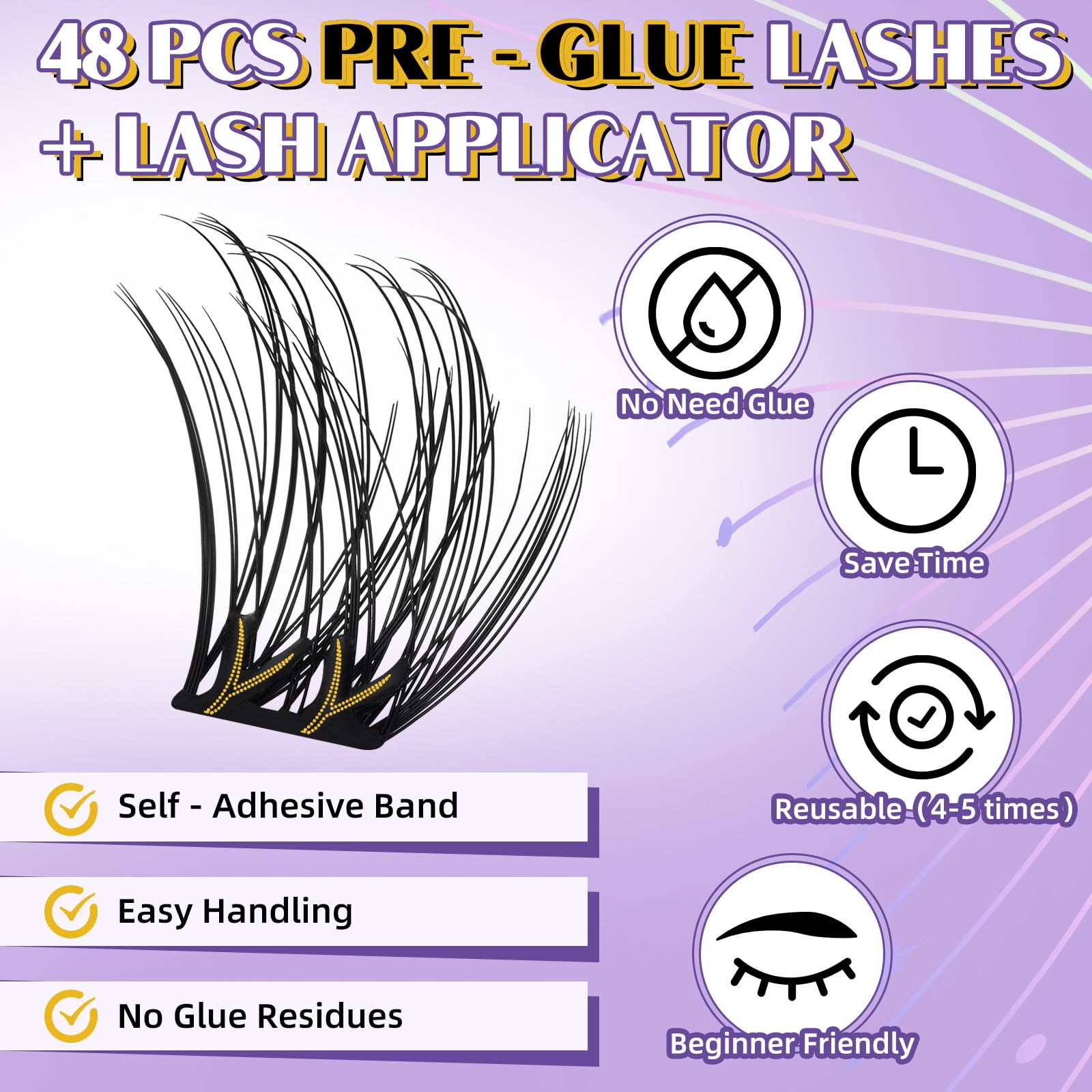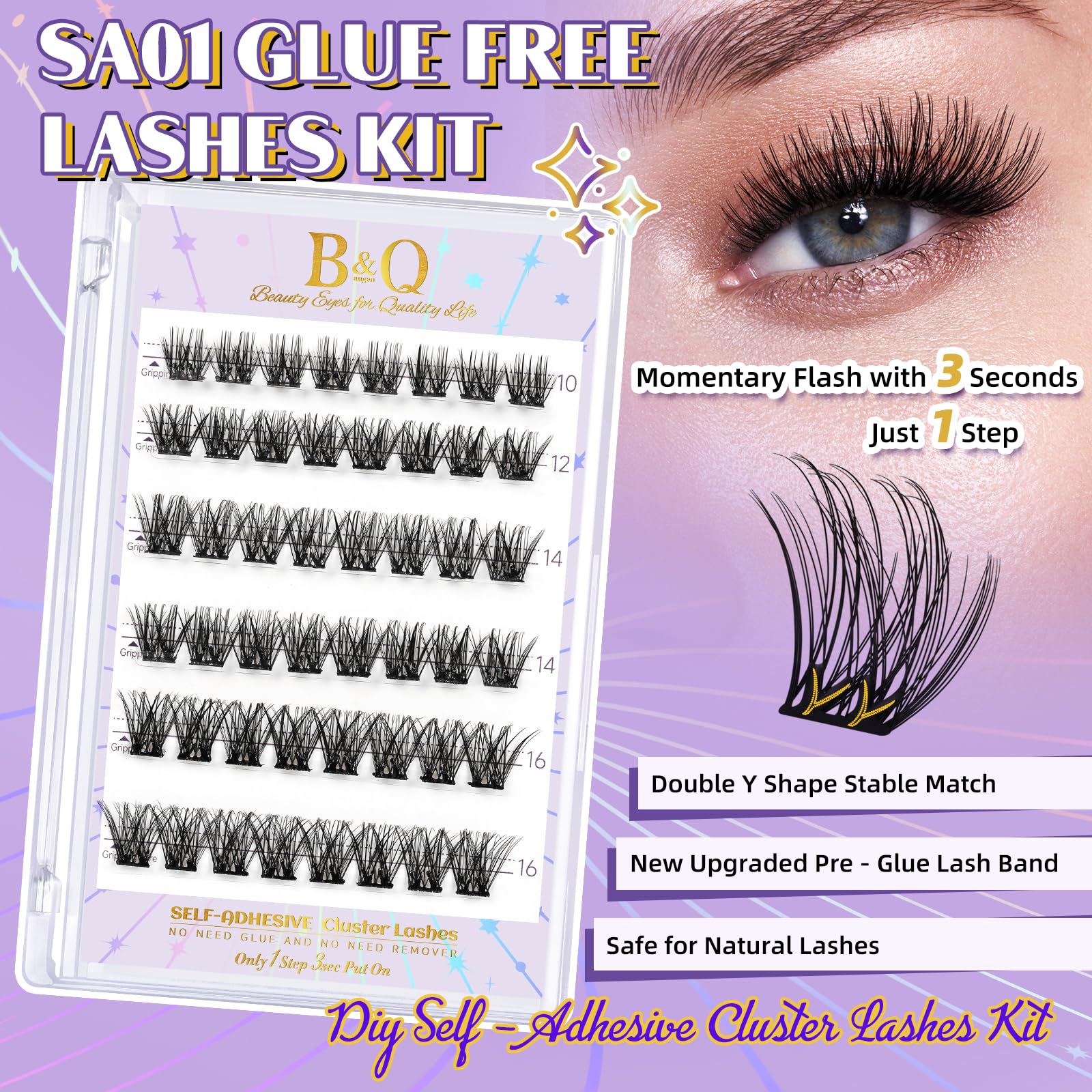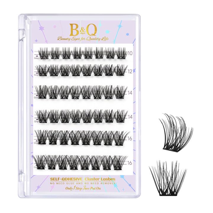 B&Q Self Adhesive Eyelashes 48 PCS Reusable Adhesive Eyelashes Pre-Glued Cluster Lashes D Curl No Glue Eyelashes 10-16mm with Lash Tweezers 1 Step DIY Lash Self Stick Easy to Apply (SA01-D)