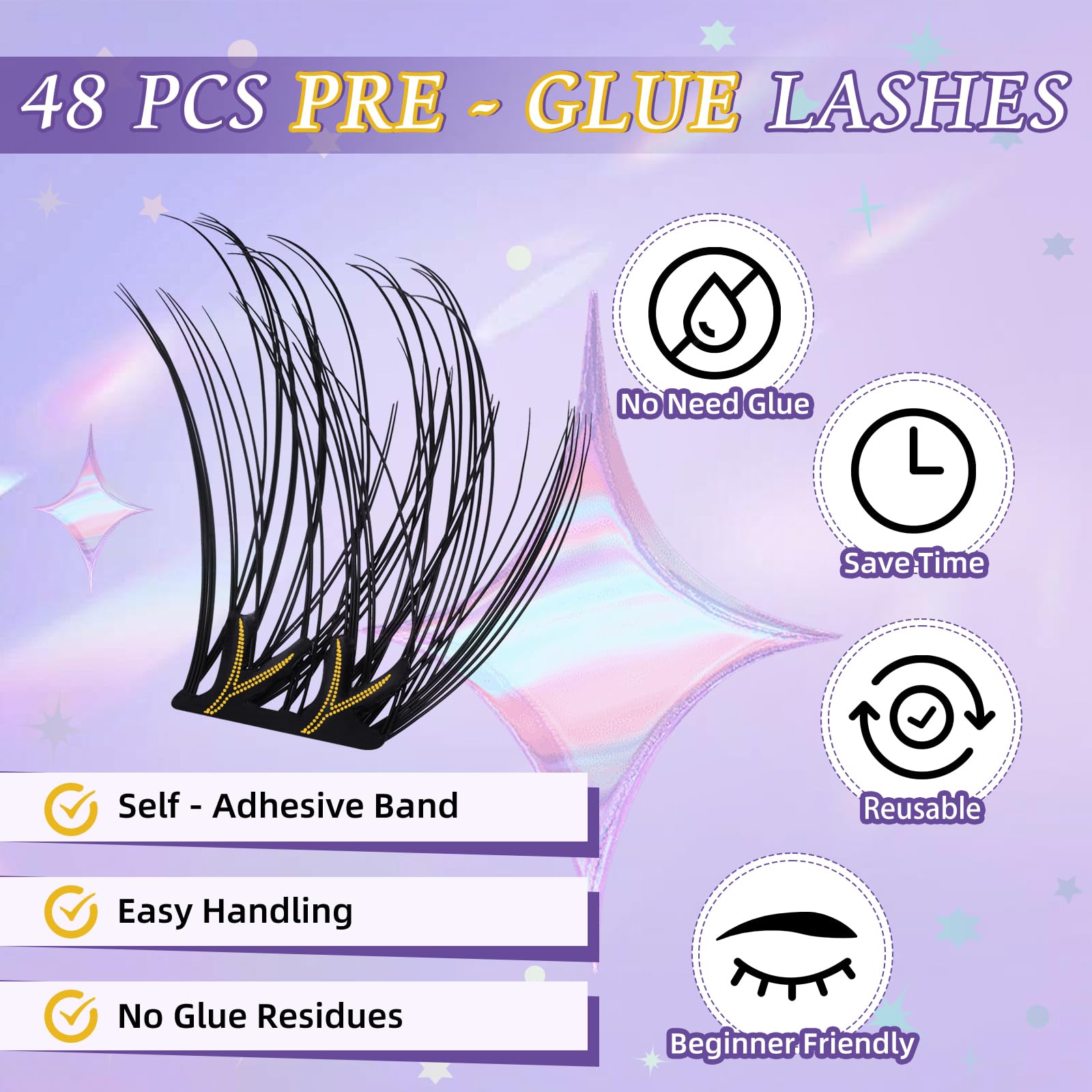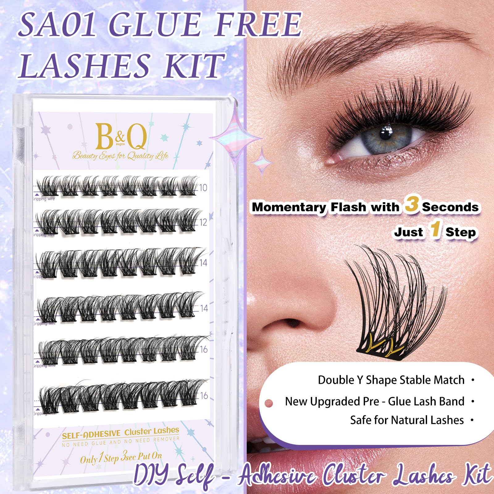 With upgraded self adhesive eyelashes , we can apply in 1 step. Compared with normal lash clusters - need to apply the glue to the lash band by yourself and wait for the glue to be half dry while wearing the lashes. Normal lashes wastes time and requires a bit more skill than self-adhesive lashes. It also takes a lot of effort to remove the glue residues. At the same time, compared with normal self - adhesive lashes - lashes already come with adhesive strips on the lash band, so there is no need to apply glue and the cost of time is reduced. However, the flat band of lashes tends to shift when attached to your own lashes and is not very stable. Our no need glue lash clusters are featured a unique Y-shaped self-adhesive claw for easy and more secure wear. There is also no irritation to the eyelids and no adhesive residues after removal.