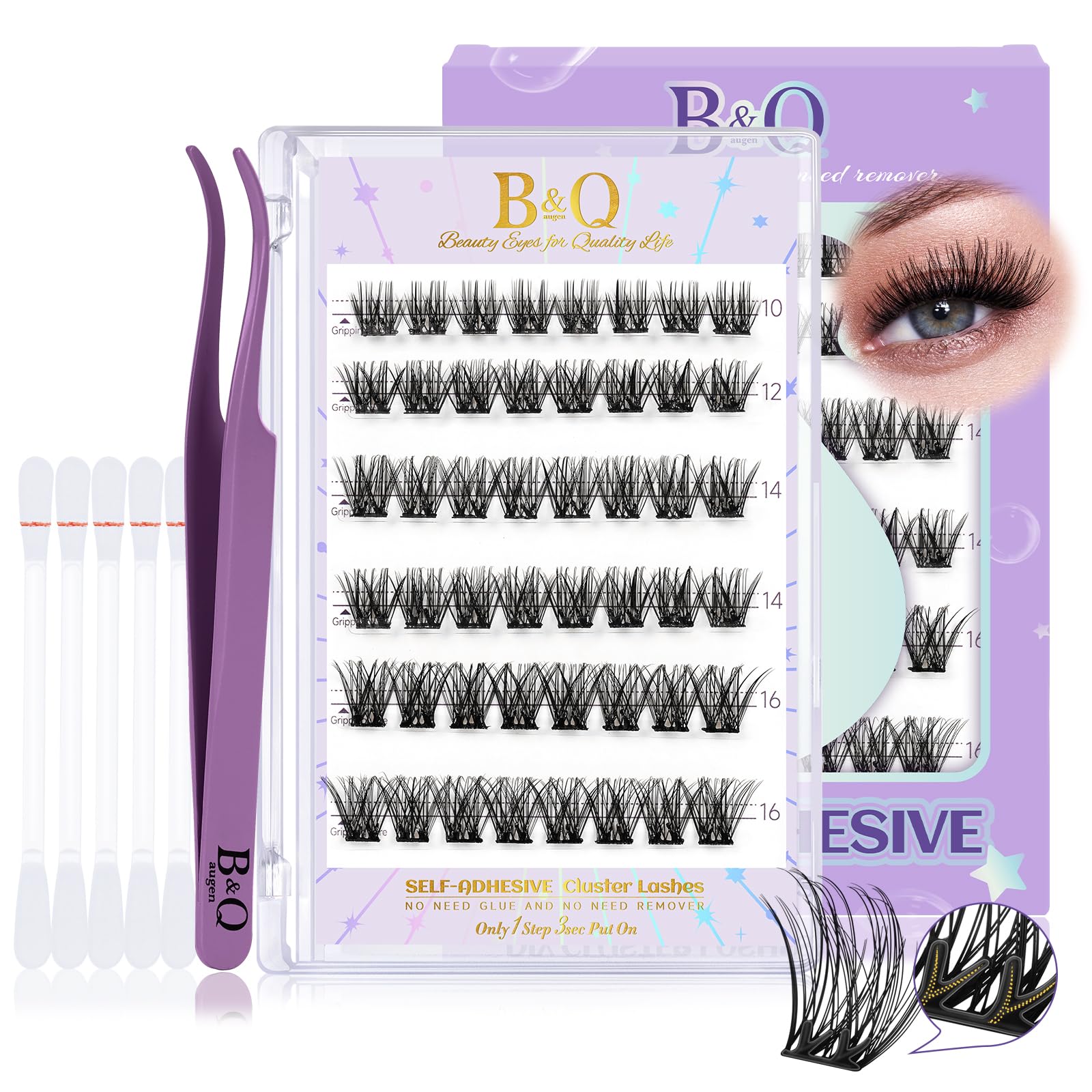 Why choose B&Q self adhesive eyelashes ? 1. No extra glue required. 2. No need to remove extra and 0 burden on the eyes. 3. The new design of the pre - glued band allows for a stable blend with the natural lashes. 4. Comes with a double-ended applicator with tweezers on one end and a comb on the other.