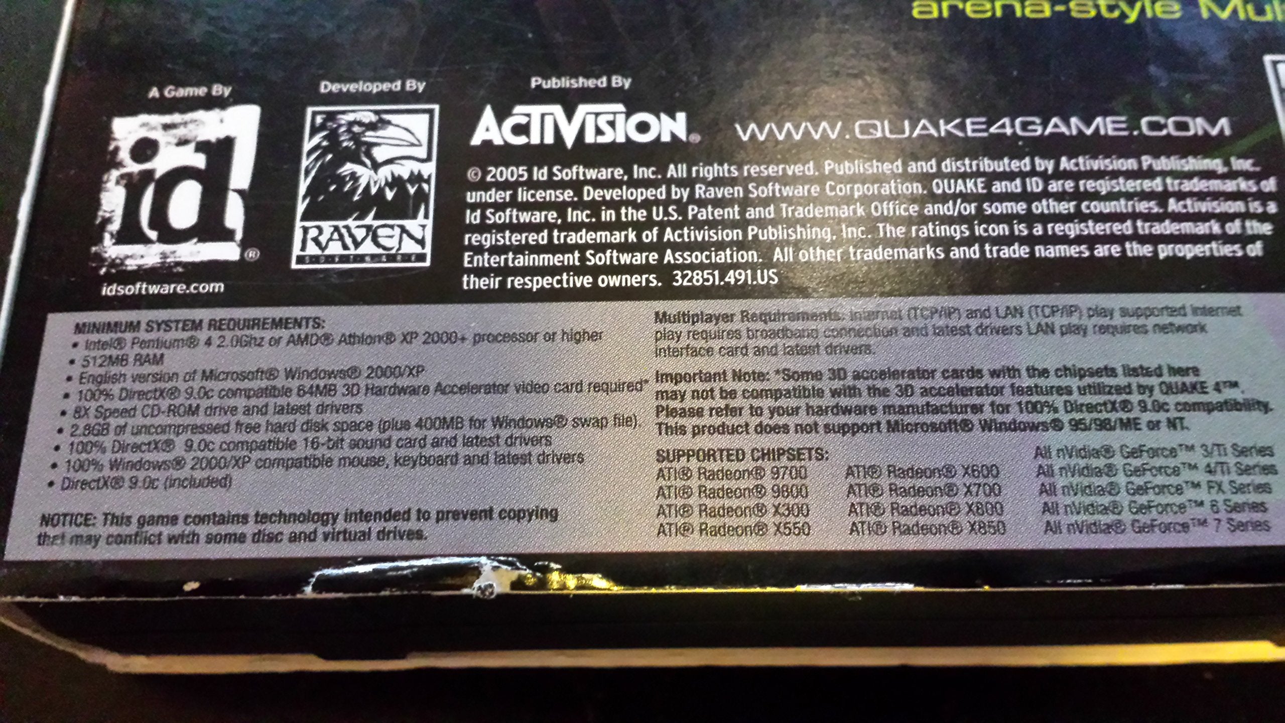 From the ManufacturerIn the mid-21st century, a barbaric alien race called the Strogg launched a massive invasion on Earth. Originally believed to be an attempt to strip the planet of its natural resources, humans soon discover that the Strogg are simply after only the human remains of those they kill. Through a horrific process, the limbs and flesh of the fallen are fused with metal and machinery to create the monstrosities that are the alien Strogg.The Strogg and humans battle for years on Earth, but as resources become depleted, Earth mounts a counter-assault on the Strogg homeworld. The first assault force is launched from the fleet and encounters overwhelming resistance--most of the drop-ships are destroyed by the Strogg homeworld's massive defense weapon known as "The Big Gun." However, one surviving Marine breaks through and is able to destroy the big gun and ultimately defeat the Strogg leader, the Makron. But the war did not end there.You are Matthew Kane, a member of the elite Rhino Squad and part of the next massive invasion that spans across the entire Stroggos planet. Equipped with hi-tech weapons, vehicles and teamed with Earth's top marine squadron you soon realize that this war is far from over. In fact, your worst nightmare is soon realized when you discover that the only way to defeat the Strogg is to become one of them.Product Descriptionid Software’s QUAKE 4, developed by Raven Software, takes players into an epic invasion on a barbaric alien planet in one of the most anticipated first person shooters for 2005. Where in order to defeat the Strogg, you must become one of them.