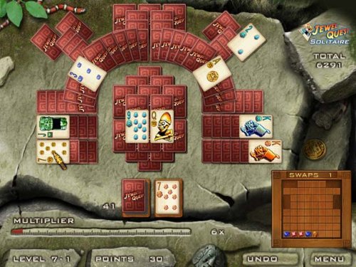 The creative minds behind Jewel Quest return with a Solitaire game filled with riches and adventure! Play Tripeaks Solitaire in a new way using jewel-themed decks. Match card suits to earn pieces for the jewel board then turn the board's spaces to gold. Unearth buried cards, avoid cursed jewels and solve the 114 card layouts on a South American jungle trek. Experience 684 possible card scenarios through an exciting new Jewel Quest story. Embark on your card playing adventure in Jewel Quest Solitaire!