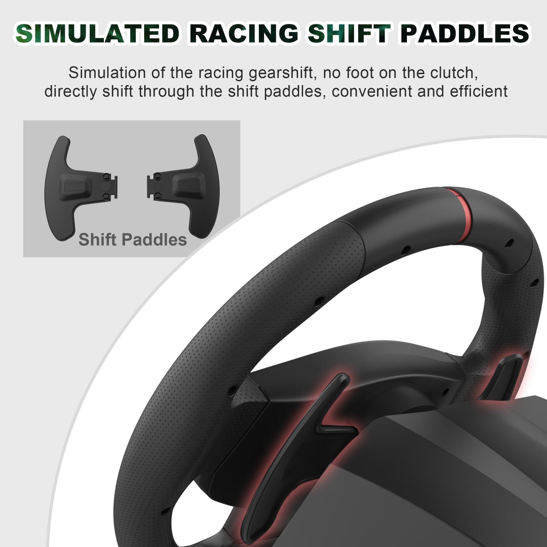 PXN V900 steering wheel simulator with pedals is a great choice to play racing or driving games for PC/PS3/PS4/XBOX ONE/SWITCH The gaming steering wheel has 270 and 900 degree rotation output for choices.With USB plug and play modes on PC. Also has 3 adjustable sensitivity levels for different experience players. Features:· Dual-motor vibration feedback and 11inch diameter gaming wheel for more realistic racing experience.· 270 and 900 degree fit for different games. 270 degree is suitable for racing competing games, like Need for Speed, Dirty, Forza Horizon, etc. 900 degree is suitable for driving games, like American Truck simulator, Euro Truck, etc.· The separate big size pedal gives you natural, responsive control with gas and brake pedal.· Grip with rubber texture coating providing anti-slip and better touch felling.· Have audio function on PS4 and Xbox 1, makes the gaming more fun. · Built-in two clamps and suction cups allow you to mount the wheel securely to desk minimizing wobbling . · Please Note : The steering wheel need original controller to hook it up when using on XBOX ONE/PS4. Specifications: · Game Accessories Type: Gaming Steering Wheel PS4 · Applicable platforms: Windows PC/PS3/PS4/Xbox one/Nintendo Switch · Connection method: USB wired(2 meters) · Key support: Programmable buttons · Steering angle: 270 and 900 degree racing wheel Packing List: · 1 x Steering wheel · 1 x Foot pedal · 1 x Mount clamps · 1 x User manual