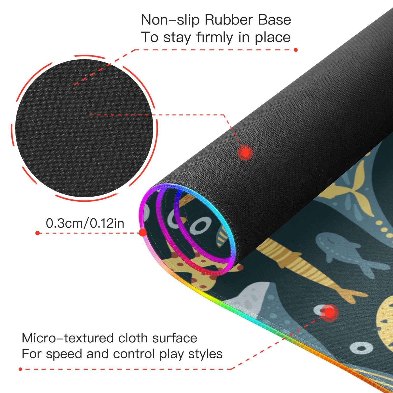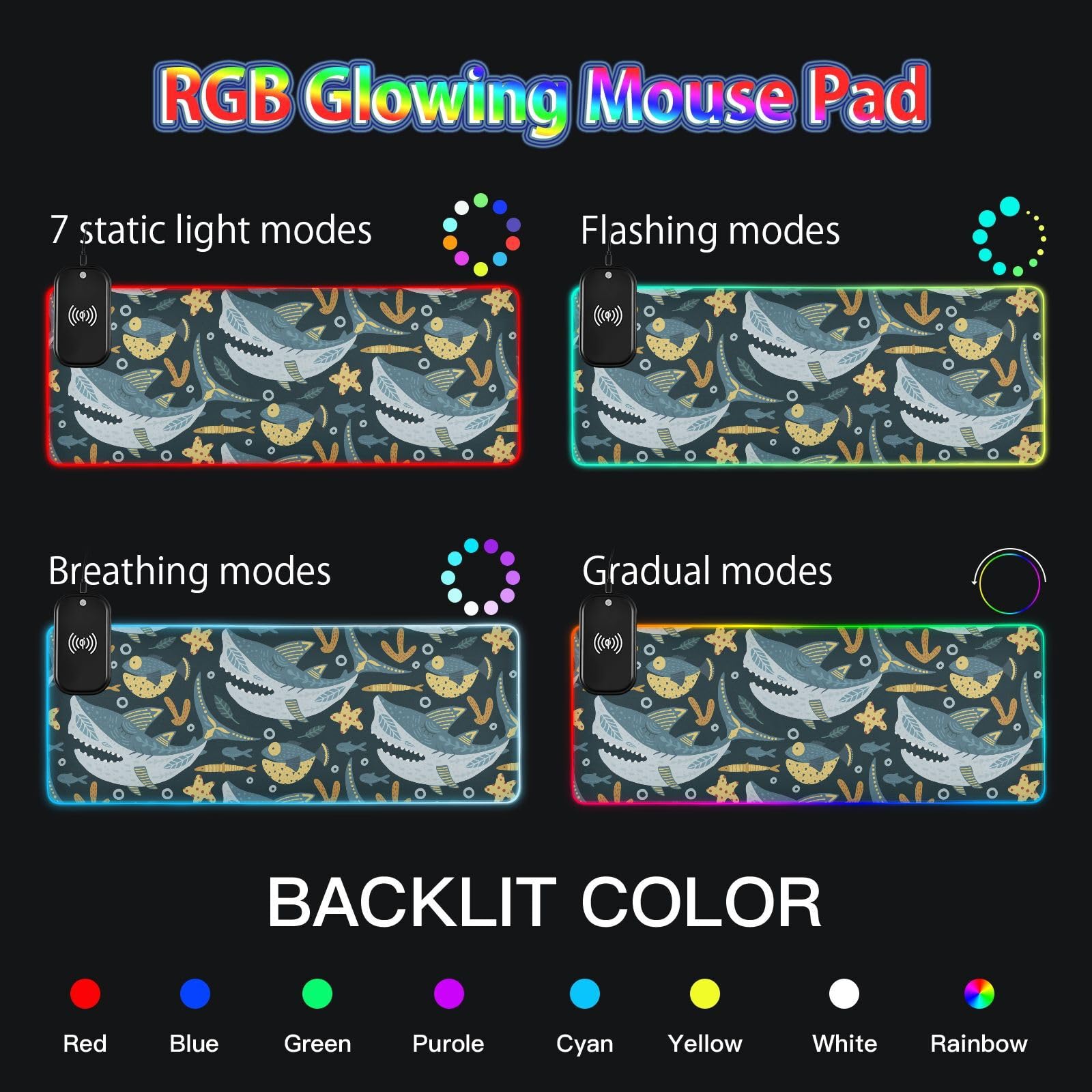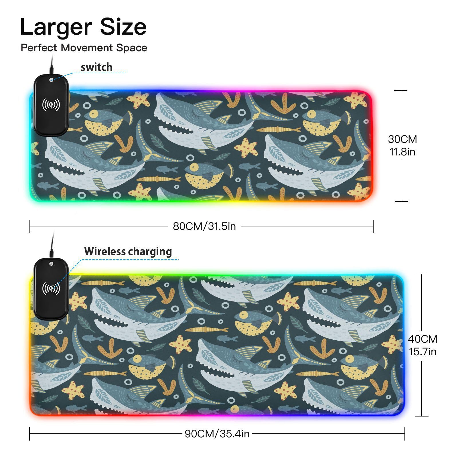 Funny Shark Fish Wireless Charging Mouse Pad for Mobile Phone Extra Large Gaming Mousepad with 13 Lighting Modes Mouse Mat for Gaming MacBook PC Laptop Desk Home Office
