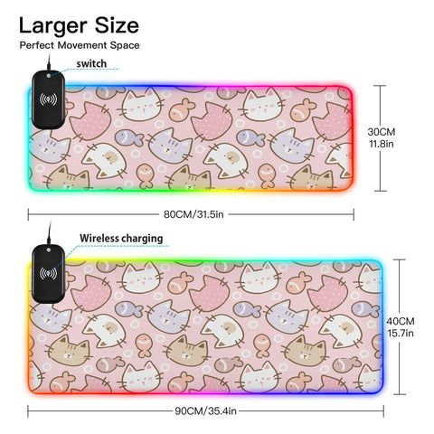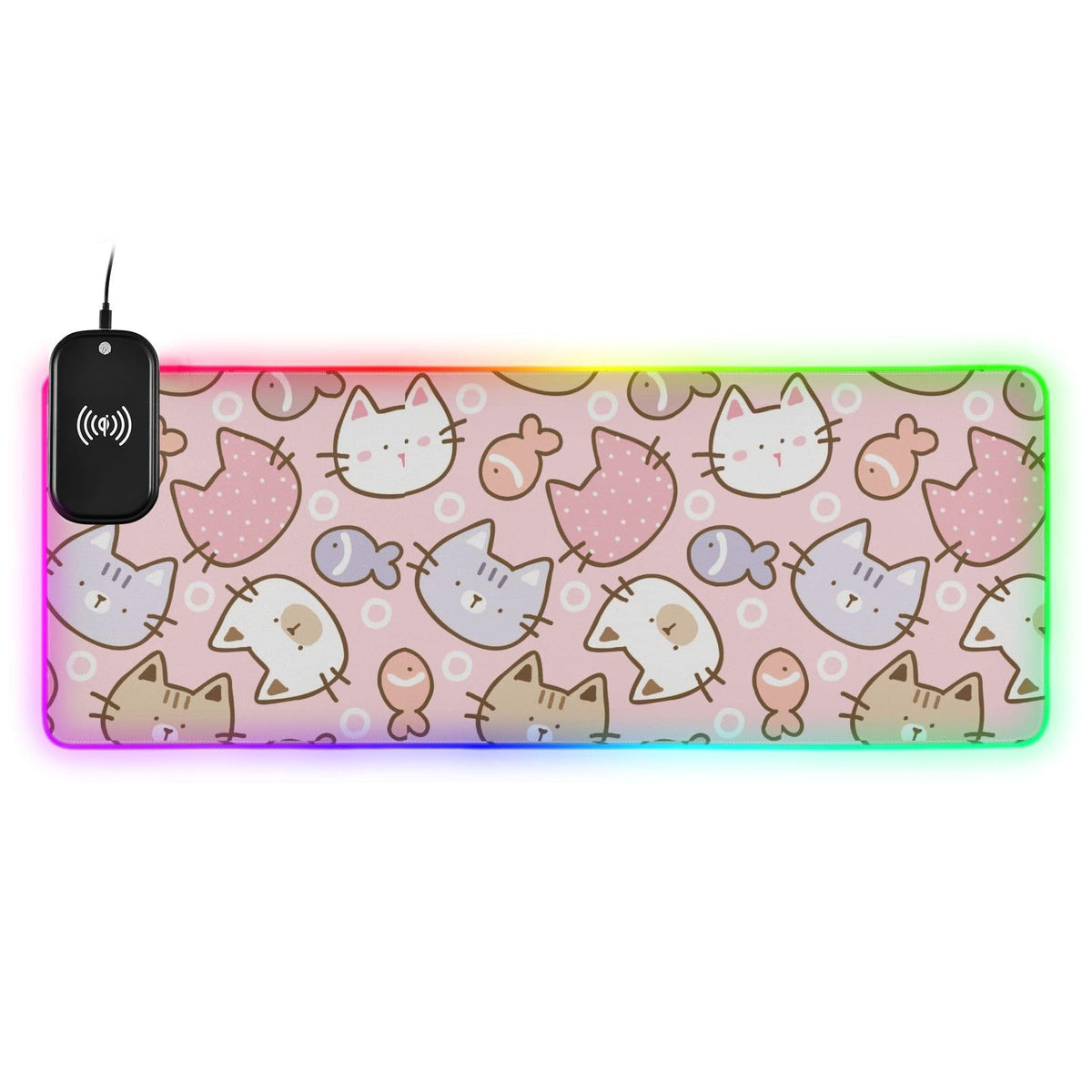 Cartoon Cat Fish Wireless Charging Mouse Pad for Mobile Phone Extra Large Gaming Mousepad with 13 Lighting Modes Mouse Mat for Office Home Gaming MacBook PC Laptop Desk
