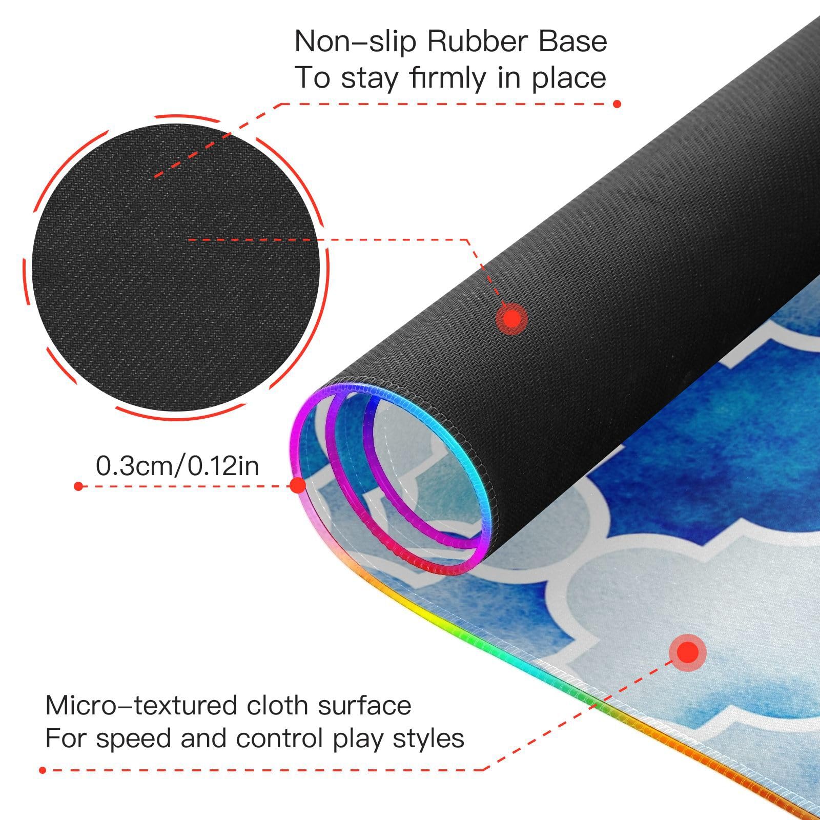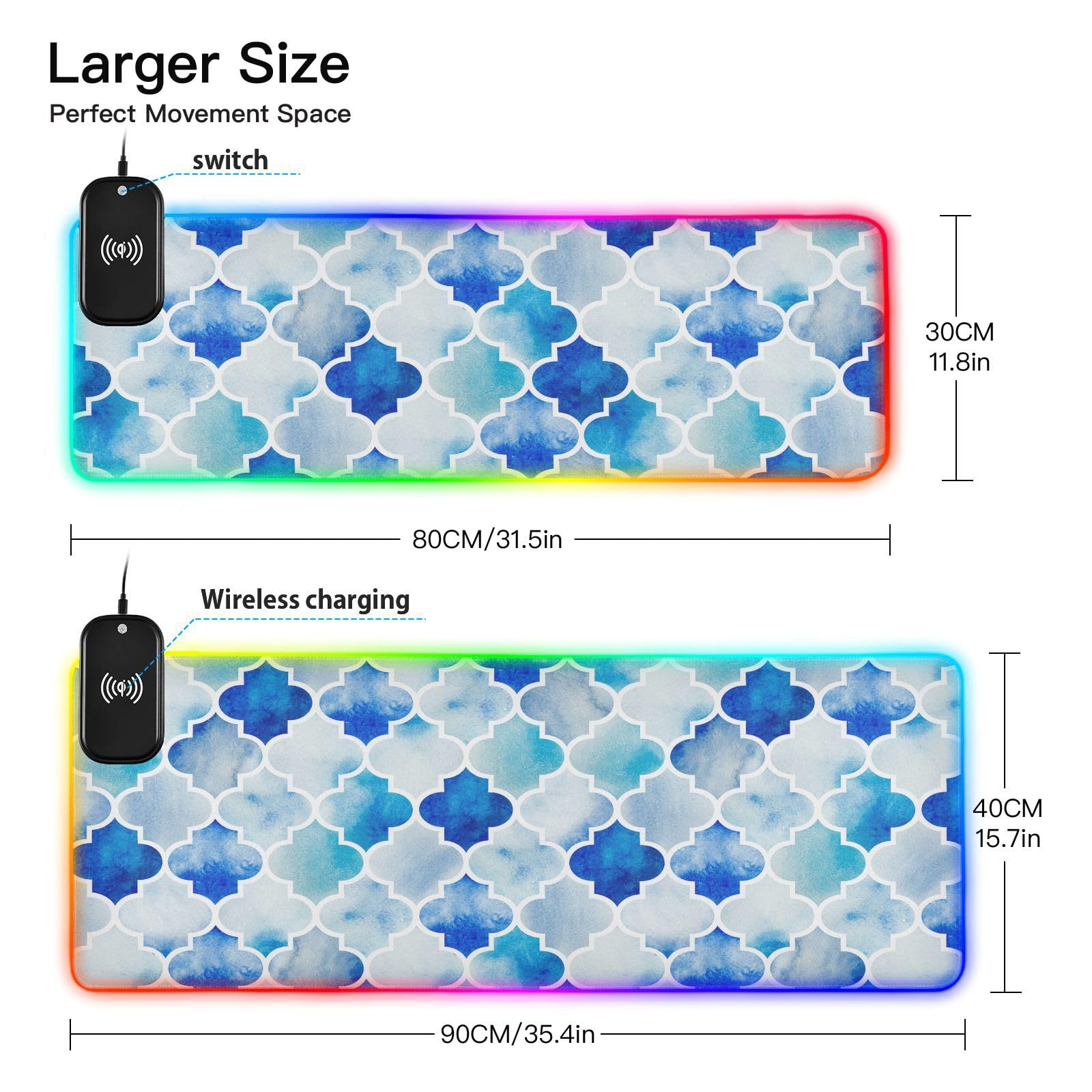 Blue Moroccan Tile Wireless Charging Mouse Pad for Mobile Phone Extra Large Gaming Mousepad with 13 Lighting Modes Extended Desk Mat for Gaming MacBook PC Laptop Desk Office Home