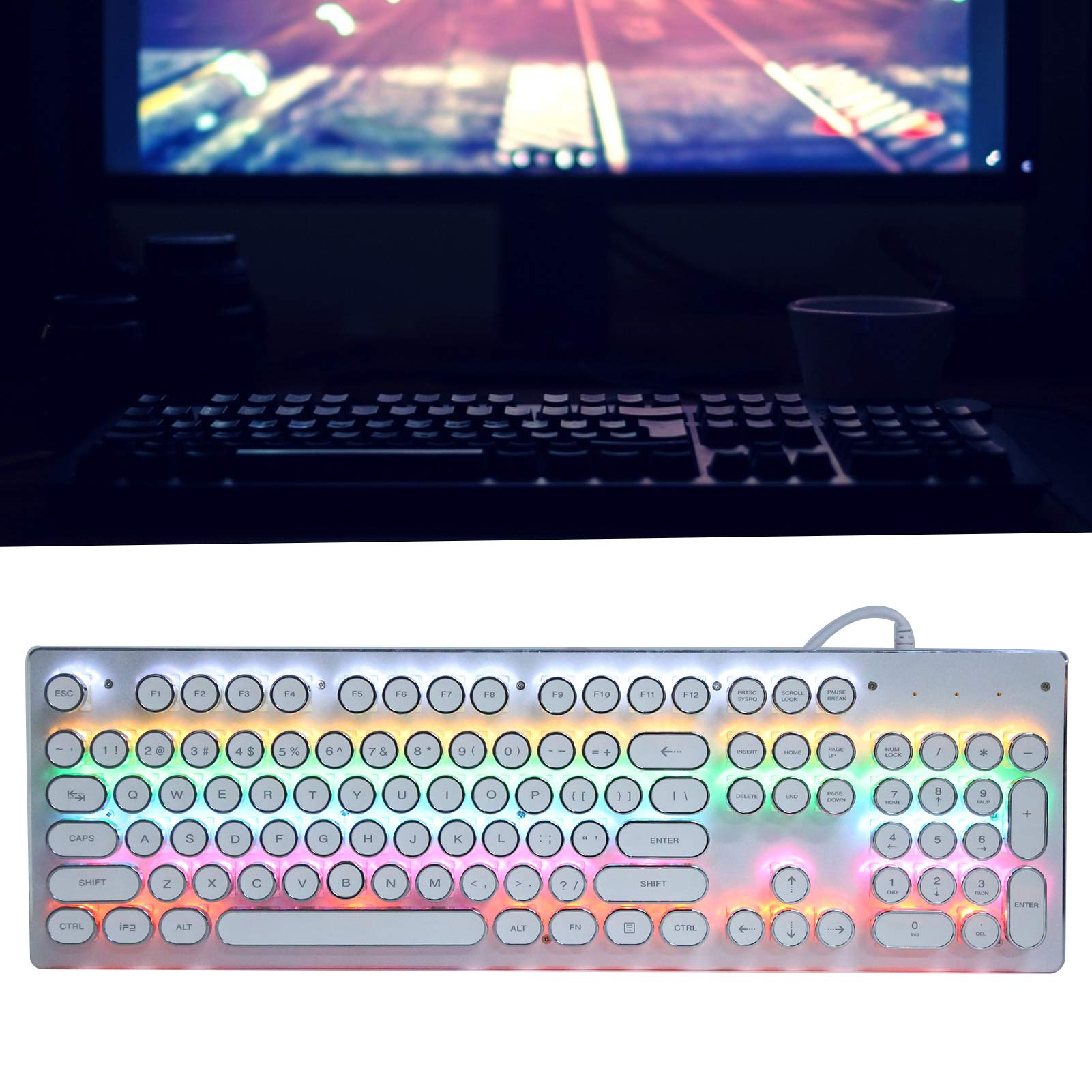 1. 104 gaming key click mechanical buttons, , not easy to damage, do not need to be replaced frequently.2. Comes with mixed light, the reaction speed is sensitive, no need to wait, and more fun.3. Classic punk retro style, waterproof and dustproof, plug and play, which is convenient.4. Ergonomic gaming keyboard design provides the most comfortable gaming experience.5. It is universal for desktop and laptop computers, and the cable length is about 1.5m/4.9ft.Specification:Item Type: Gaming KeyboardMaterial: ABSModel: HJK920Number of Keys: 104 keysInterface: USBBacklight Type: Mixed lightCable Length: Approx. 1.5m/4.9ftFeatures: Support plug and playApplicable Equipment: General for desktop and notebook computersPackageList:1 x Keyboard2 x Spare Shaft 1 x Key Puller1 x Manual