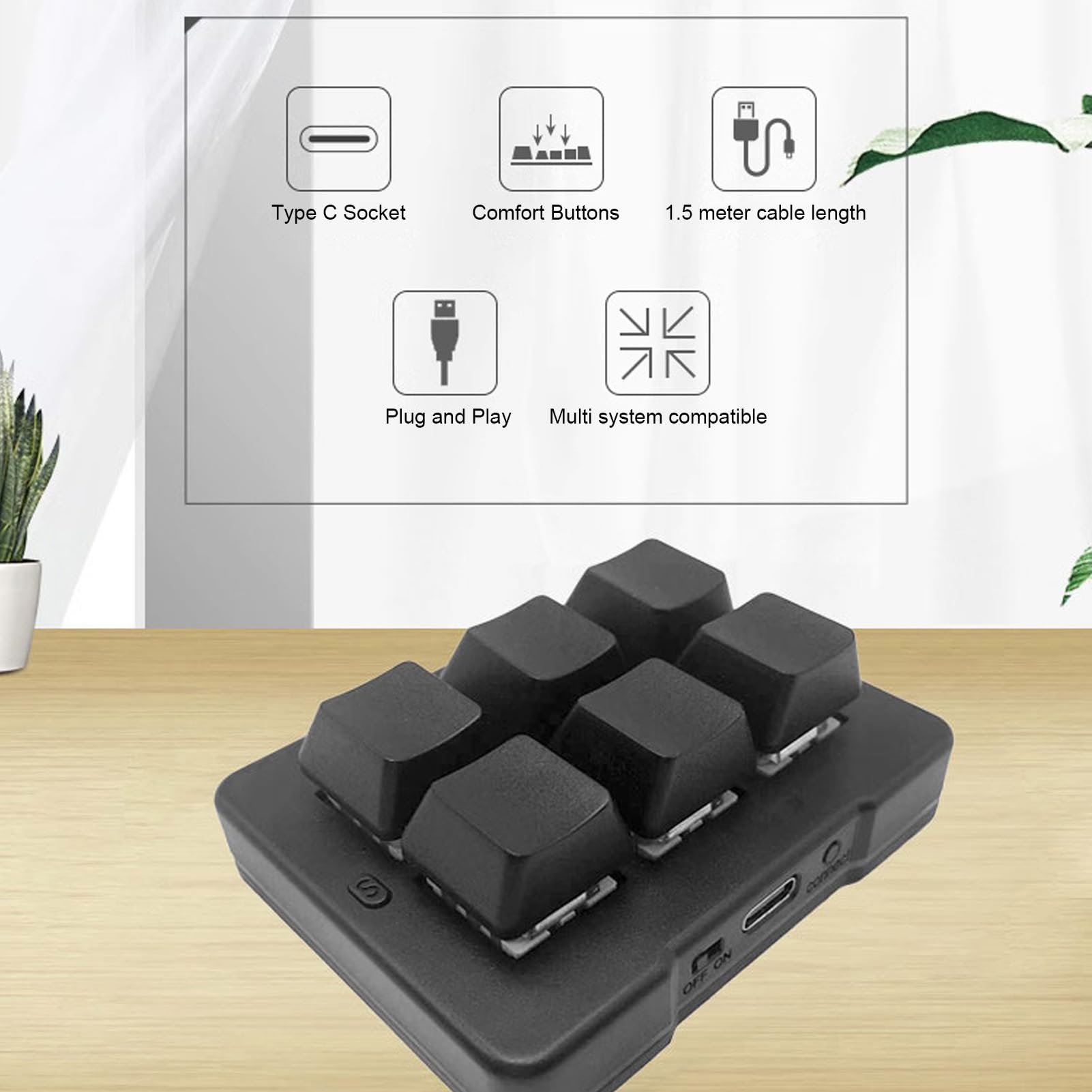 1. Multiple Connectivity Options: The 6 key gaming keyboard supports wired USB, 2.4G, and connectivity modes, giving users more choices for pairing and connecting whether they are working from home or on the go.2. Customizable Macro Programming: Users can define each key according to their needs, enabling more complex operations. This enhances daily work efficiency and simplifies multiple actions in games with just one key press.3. Mechanical Key: Featuring a blue switch design for crisp tactile feedback and long lifespan, the mechanical gaming keyboard ensures stability during extended use, providing users with a lasting and comfortable typing experience.4. Vibrant RGB Lighting Effects: Equipped with an integrated RGB lighting system offering various effects to choose from, the PC keypad enhances visual appeal with wonderful lighting effects, adding vibrancy to your desktop, whether for work or gaming.5. Wide Compatibility: Compatible with all types of computers, whether running for Windows, for iOS, or for Linux operating systems, this keyboard is a versatile tool for work, study, and entertainment, making it a great companion for various users.Spec:Item Type: 6 Key Gaming KeyboardMaterial: ABSConnection: Wired USB, 2.4G, Mechanical Axis: Blue SwitchLight Effect: RGBBattery Type: Built in 230mAh Lithium Ion BatteryApplication: Universal for ComputerHow to Use:Wired USB Mode: Plug and playBluetooth Mode: Long press the 'connect' button for three seconds in mode to enter pairing status (red flashing slowly). You can search and connect with devices such as computers or phones with function. When connected successfully, the device's red lights will stay on for 2 seconds and then turn off.2.4G Mode: Long press the 'connect' button for three seconds in 2.4G mode to enter pairing status (green flashing slowly). Insert the receiver into the computer at this time, and the device and receiver will pair