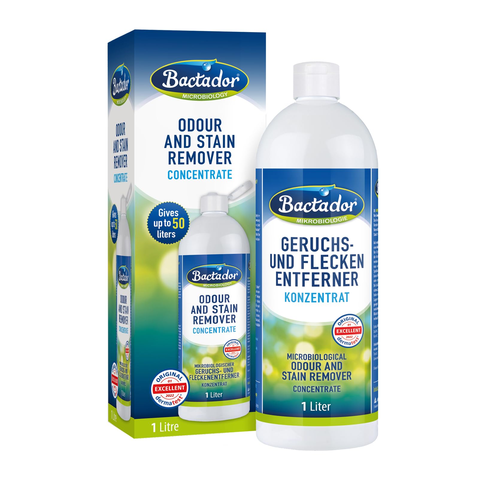 DescriptionProduct DescriptionThe Bactador concentrate is particularly economical: 1 litre makes up to 50 litres Intensive cleaning In order to remove odours and stains properly and sustainably, it is necessary not only to mask the source of the odour, but to remove it effectively. The Bactador odour and stain remover is ideal for reliable use in the household and in the animal environment, e.g. for sweat, saliva, vomit, faeces/urine stains, pet odours, territory markings and much more. Bactador microbiology The original, highly effective Bactador technology with probiotic microorganisms combats the cause of odours and neutralises odours and stains deep down and permanently. The Bactador microbiology offers a sustainable alternative to aggressive, chemical cleaning agents: gentle on material ans skin and suitable for humans and animals.IngredientsContains: Microorganisms cl. 1 The product does not fall under the regulation for biocides! Ingredients according to the EU Detergents Regulation: less than 5 % anionic surfactants, non-ionic surfactants; Fragrances; Limonene; Benzisothiazolinone; BronopolDirections"Shake bottle well before use. Mix the concetrate depending on the soiling as follows: normal: 1:50 (=20 ml to 1 litre of water) strong: 1:10 (=100 ml to 1 litre of water) On sensitive materials, first test on a small concealed area. Before starting to clean, the dirt should be roughly removed. Then wipe with Bactador or apply with a spray bottle and allow to dry. Do not rinse with water or use other cleaners. In the case of stubborn odours and soiling, repeat the processand rub in additionally with a cloth. "Safety WarningNot suitable for consumption. Do not expose bottle to direct sunlight. Protect against frost. Use mixture within 4 weeks.Box ContainsBactador Odour and Stain Remover Concentrate 1000ml