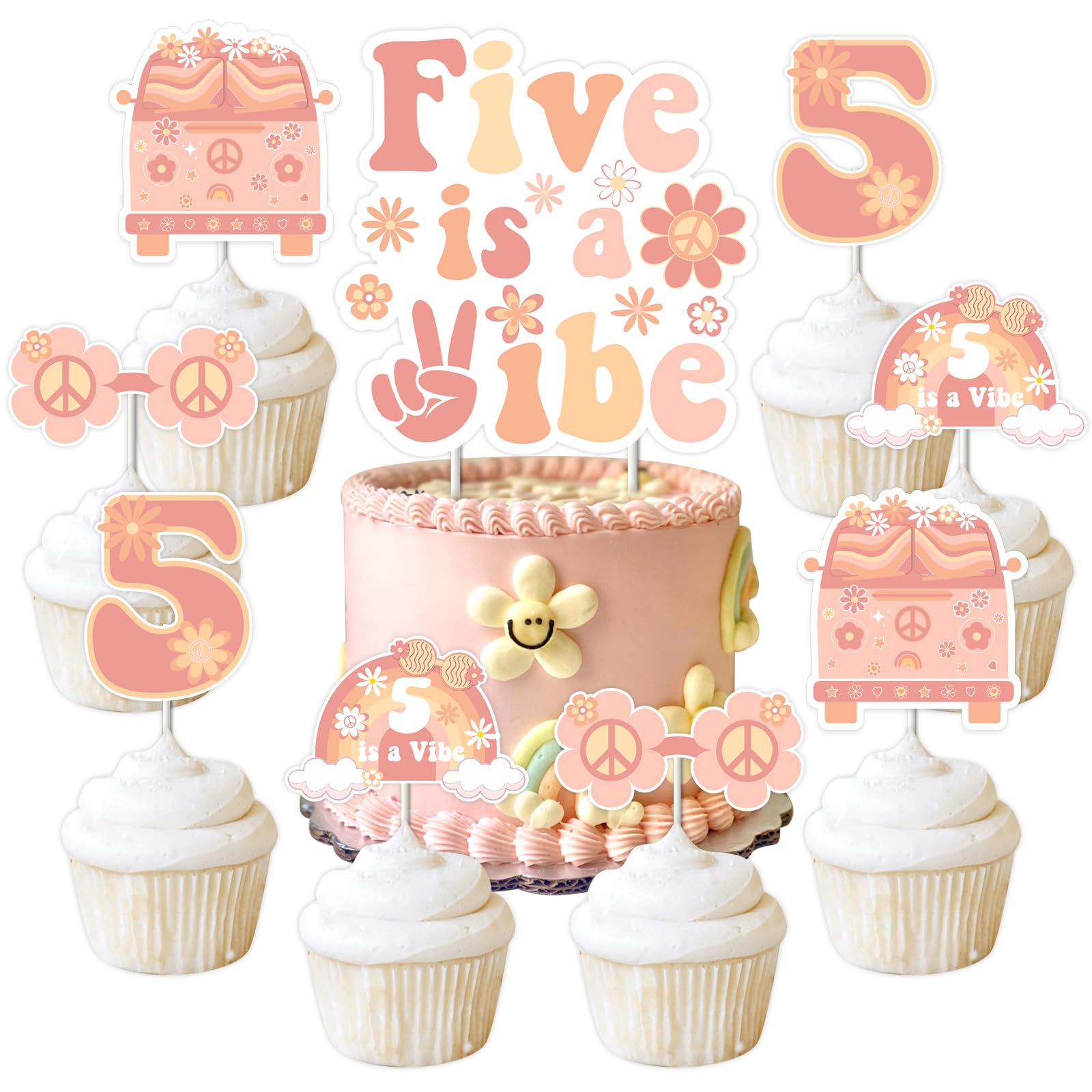 Package list: 1pc five is a vibe birthday party cake topper 24pcs five is a vibe birthday cupcake toppers with 4 different patterns