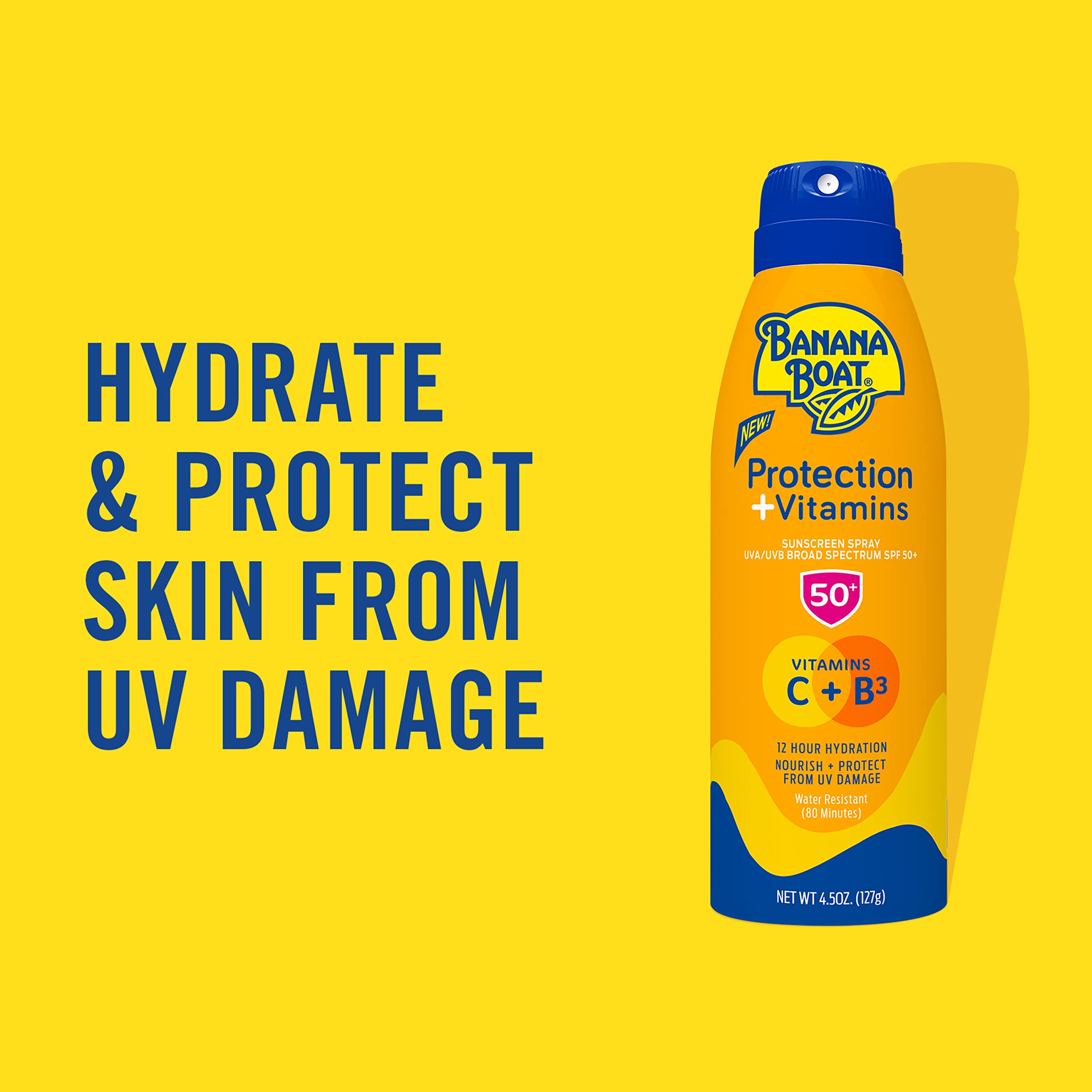 Banana Boat Protection + Vitamins Moisturizing Sunscreen Spray with Vitamin C and B3 (Niacinamide) is the SPF moisturizer multitasker! Nourish, hydrate, and rejuvenate your skin every day with an advanced moisturizing sunscreen spray formula that takes our famous UV protection and enriches it with vitamins. Vitamin C is a powerful antioxidant known for its ability to neutralize free radicals, stimulate natural collagen production, and visibly brighten your skin. Niacinamide (also called vitamin B3) is known to reduce the appearance of skin discoloration while helping your skin retain moisture, supporting and restoring the skin’s important barrier function. Lightweight and breathable, advanced SPF 50 Banana Boat sunscreen spray with vitamin C and niacinamide absorbs easily, giving you 12-hour hydration along with UVA/UVB protection for every kind of outdoor fun. Plus, our vitamin C and niacinamide moisturizer sunscreen is water resistant for up to 80 minutes, so you’ll stay protected in and out of the water.
