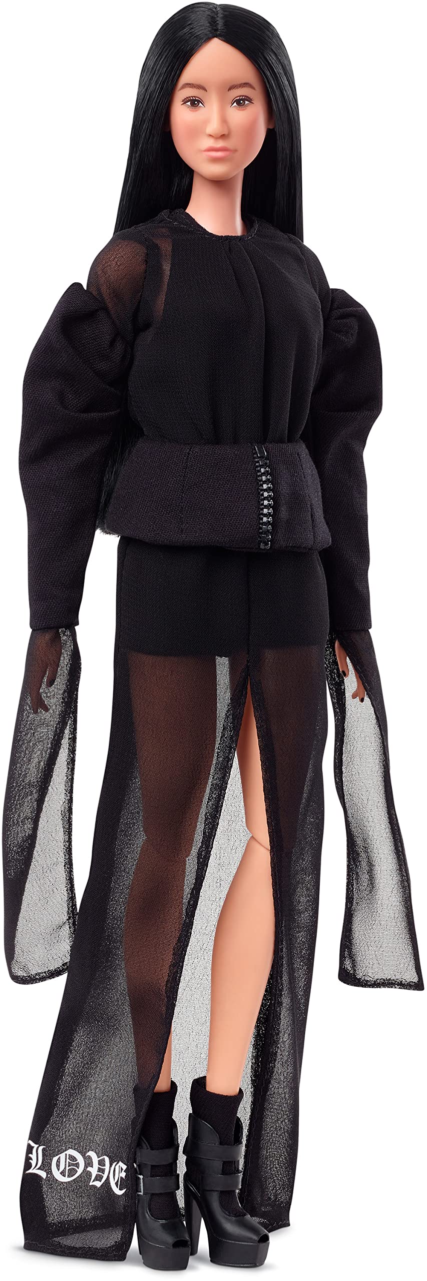 The Barbie Tribute Collection celebrates visionaries whose incredible contributions have helped shape and impact culture. Vera Wang is an iconic designer and businesswoman who grew her brand from a small bridal boutique into a fashion and lifestyle empire. She has earned numerous awards for her powerful contributions to the fashion industry -- including the Legion of Honor from France -- a testament to her enduring creativity and lasting impact on fashion and culture. Inspired by a look from her 2017 ready-to-wear collection, Vera Wang Barbie doll wears a monochromatic ensemble featuring a black romper under a chiffon dress with attached puff sleeves, a front slit and the word LOVE featured at the hem. A peplum belt with a zipper detail, black socks and platform heels with sculpted buckle details complete her look. In beautiful, displayable packaging, this fully posable Vera Wang Barbie doll makes a great gift for collectors. Includes doll stand and Certificate of Authenticity. Colors and decorations may vary.