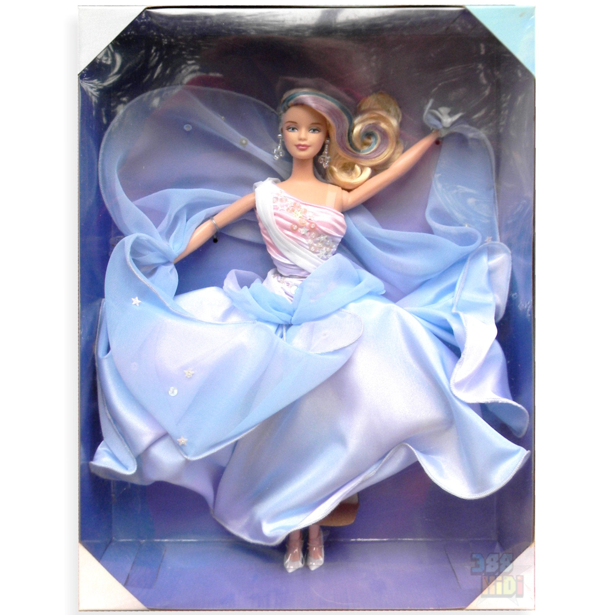 Whispering Wind Barbie, who gracefully rides on the wind, has a very magical aura about her. Her iridescent blue-lilac skirt and chiffon stole both have soft, wire supports that make her elegant outfit seem to swirl and billow around her. The pink satin bodice of her gown is accented by white shimmering, star-shaped sequins, and a delicate dove hangs on her skirt, implying that she is close indeed to these majestic inhabitants of the sky. With long, wavy, platinum hair streaked with lilac and blue, Barbie is the embodiment of ethereal grace, nature, and freedom. As a collectible, the doll thoughtfully comes with a matching stand, and a two-year manufacturer's warranty.
