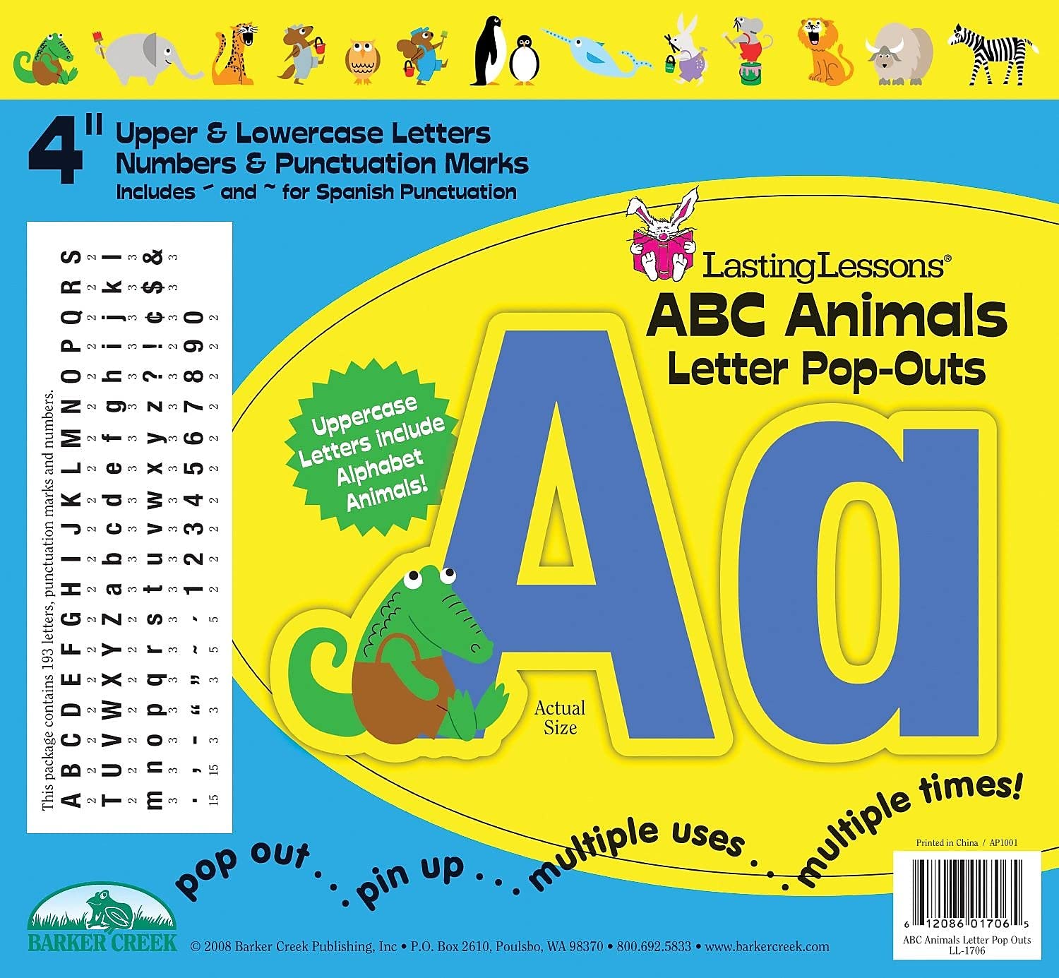 your next decorating project will "pop" with these colorful 4" letters from Barker Creek! The style of the drawings was inspired by illustrated children's books published in the 1950s and 1960s. This is a darling line that is perfect for preschool and kindergarten classrooms. Be sure to see the coordinating borders, file folders, name tags, computer paper, library pockets, charts, and library pockets! This set includes 193 letters (uppercase and lowercase), numbers, and punctuation marks. Each uppercase letter has a companion animal attached to it -- A = alligator, B = bear, Z = zebra, etc. Coordinates with Barker Creek's ABC Animals line of products.