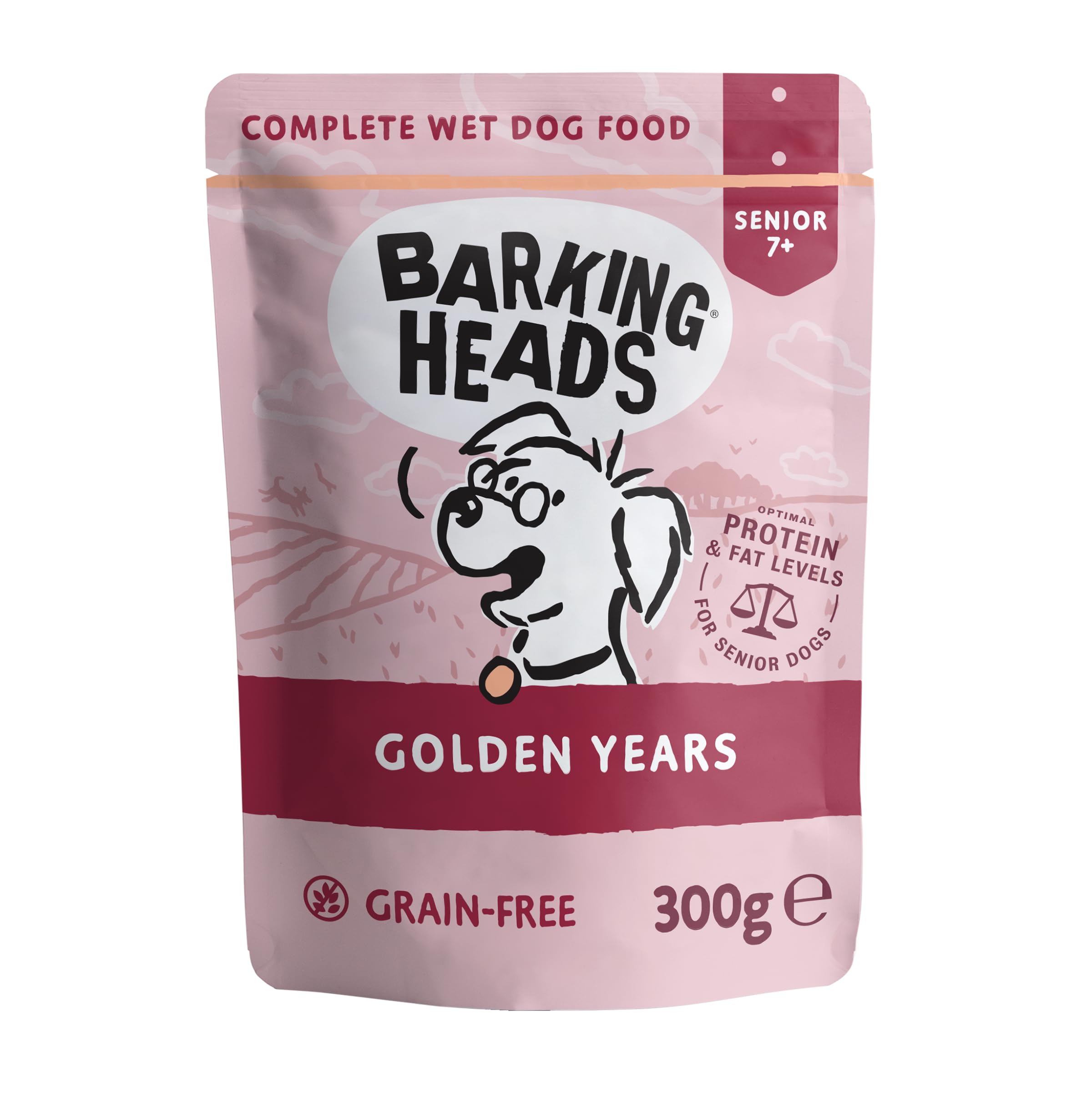 Product DescriptionA complete wet food for 7+ years adult dogs - made with all natural ingredients and 85% meat. A blend of fresh chicken, salmon, garden veg & herbs. Case of 10x 300g pouch format - with reseal sticker to split portions.IngredientsComposition: 85% Chicken & Salmon includes - Fresh Deboned Chicken (40%), Chicken Broth (25%), Fresh Salmon (20%), Sweet Potato, Carrots, Courgette, Spinach, Tomato, Salmon Oil, Sunflower Oil, Green Lipped Mussel Extract, Seaweed, Lucerne, Parsley, Celery, Chicory Root, Nettle, Turmeric, Aniseed, Green Tea, MineralsBox Contains10x pouches of 300g wet pouch Barking Heads Golden Years