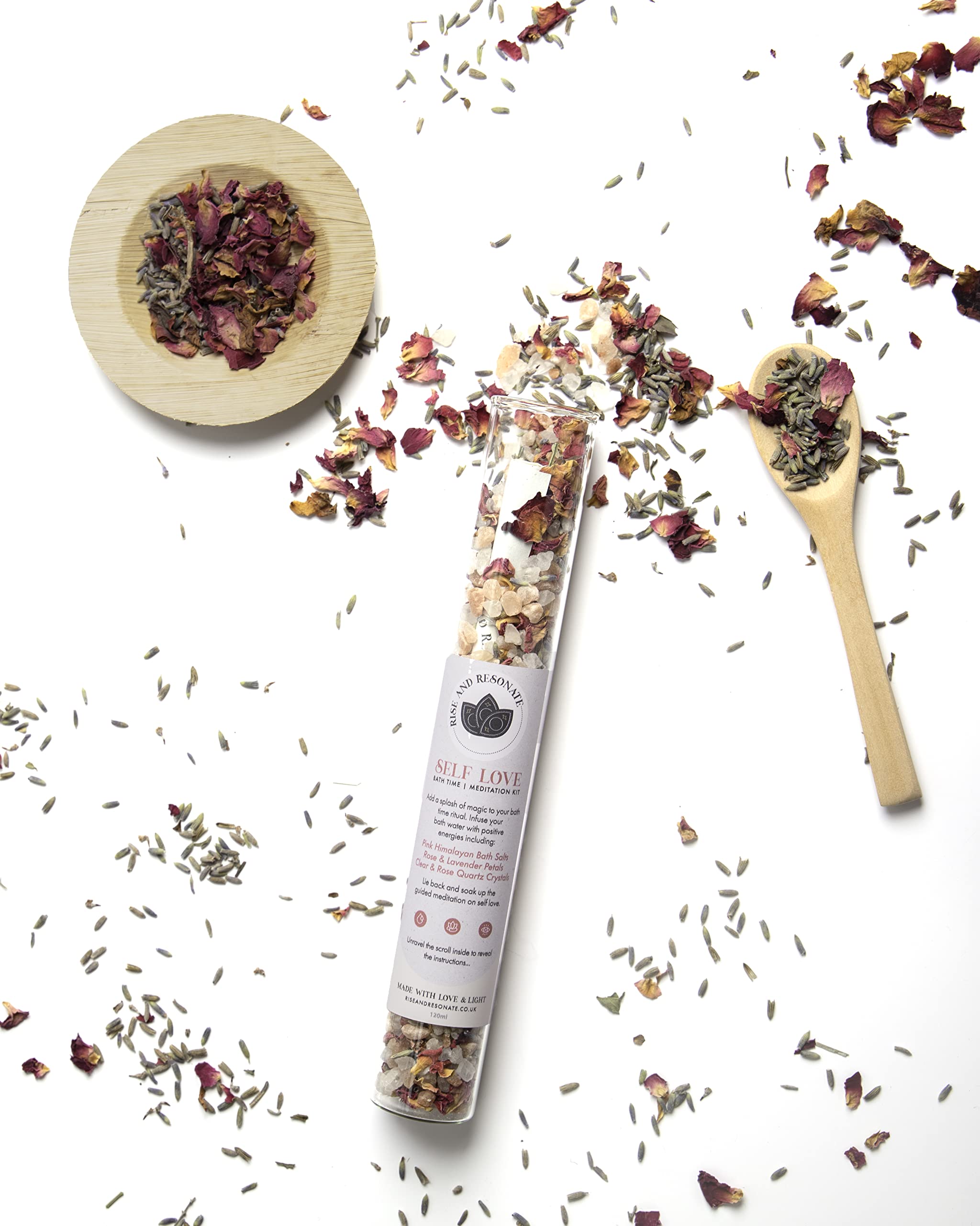 Bath Meditation Kits. (3 Themes) Includes Soaking Salts, Bath Petals, Crystals & Hidden Guided Meditation Scroll - Rise and Resonate (Self Love)