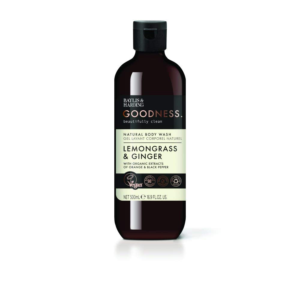 DescriptionBaylis & Harding Goodness Lemongrass and Ginger body wash. Lemongrass and Ginger - A perfectly matched compilation, with a rich heart of ginger and lemongrass, expertly blended with Black Pepper, Citrus and Bergamot for added freshness. Underpinned by nutmeg and cinnamon for spicy undertones, this sensory explosion is generously enriched by no fewer than ten essential oils; Lemongrass, Lemon, Lime, Orange, Eucalyptus, Nutmeg, Patchouli, Cedar wood, Cinnamon, Geranium. Make your shower experience indulgent with our 500ml Body Wash. Made in England. Vegan. 100% Recyclable Bottles. With mild, plant based cleansers. 95% Biodegradable Formula. Dye Free. Paraben Free. Silicone Free. Sulfate/SLS/SLES/ALES Free. Dermatologically Approved - mild & gentle. With Organic Extracts. With Essential Oils .Founded in 1970 in the Heart of England, Baylis & Harding is a family business which has grown from humble beginnings to become an award winning, international success. Beautifully made, beautifully packaged and beautifully fragranced, Baylis & Harding create gifts that are opened with delight and products to make your home feel more wonderful.