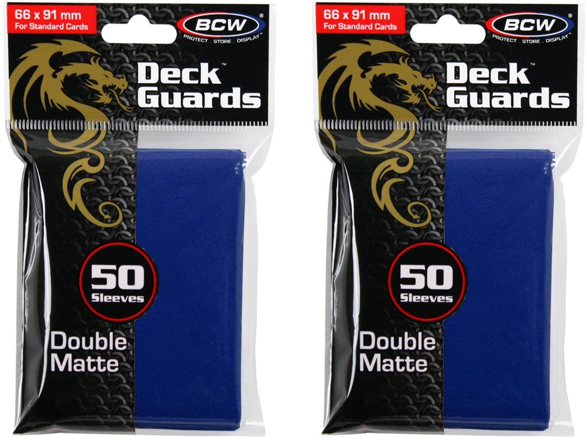 Deck Guards are firm enough to protect your cards' corners while the matte finish makes them shuffleable and easy to handle. Clear matte front helps make your cards legible from across the table. Strong seams and sturdy material means you won't bow out before you're done. 100 Count Matte Blue.