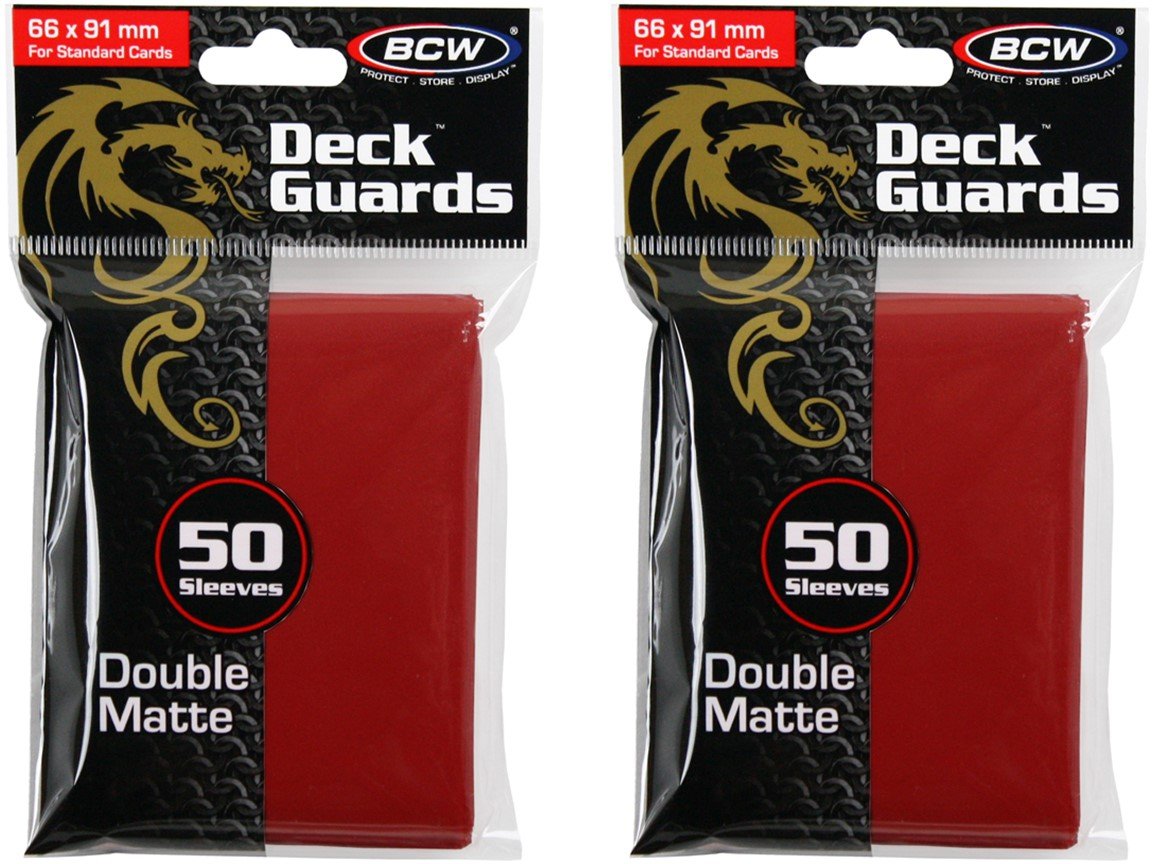 Deck Guards are firm enough to protect your cards' corners while the matte finish makes them shuffleable and easy to handle. Clear matte front helps make your cards legible from across the table. Strong seams and sturdy material means you won't bow out before you're done. 100 Count Matte Red.