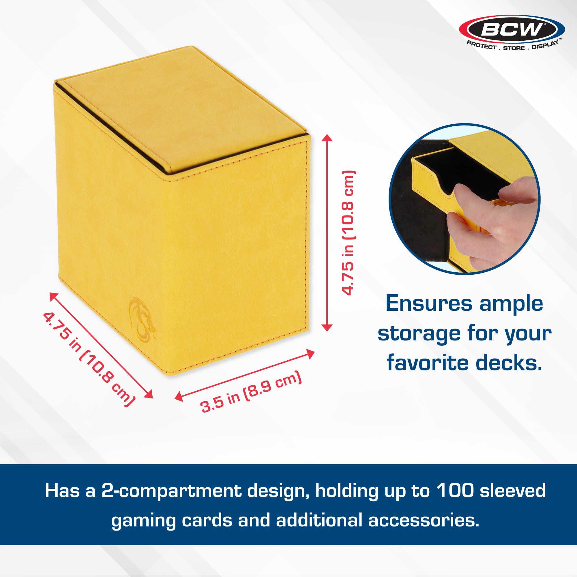 Crafted to endure and exceed expectations, the BCW Deck Vault is the ultimate card box designed to stand the test of time. With a robust padded faux leather outer shell and a luxurious microfiber faux-suede interior, this deck case provides unparalleled protection for your cards. The stitching adds a touch of contrast to its vibrant exterior, making a bold statement in both style and durability. This card holder case is a testament to enduring quality. Its sturdy construction ensures that your cards remain safe from damage, ensuring your deck is always primed and ready for the next round. The size is perfect for MTG: Elder Dragon Highlander (EDH) decks, now known as Commander decks in addition to Legend of the Five Rings (L5R). Not only does it work great for card based games, but also dice games like Dicemaster and Star Wars Destiny. This vault x box is a hearty option for storing and transporting your collectible gaming cards with dice and tokens. It is sure to impress and intimidate your weaker opponents. Whether you're a seasoned gamer or just getting started, the BCW Deck Vault LX 100 Deck Case is the perfect choice for organizing and protecting your valuable card collection. Elevate your gaming experience with style and functionality.