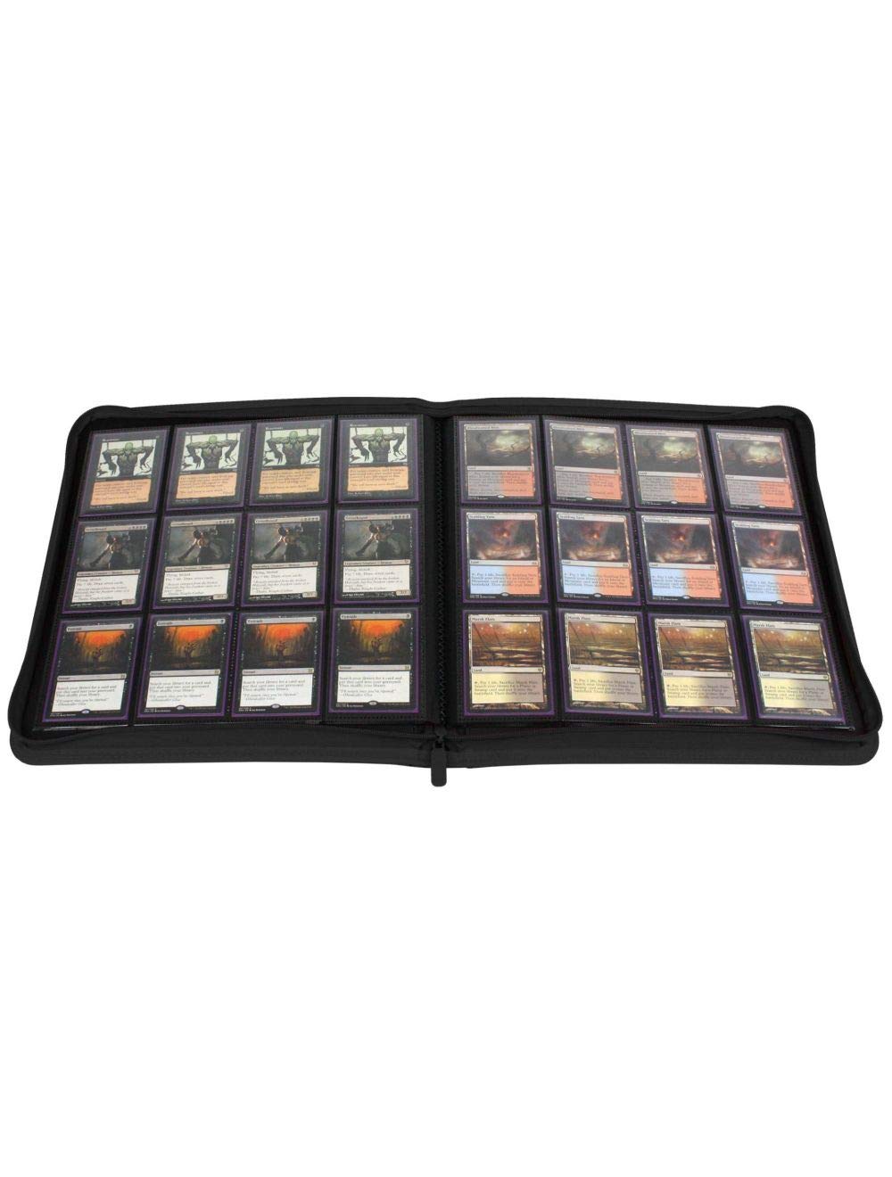 The BCW zipper-folio-lx will accommodate 480 cards and features a padded leatherette front and back cover with contrasting colored stitching and wrap around zipper. Side-loading pockets deter the cards from sliding out of place. The 12-pocket pages are ideal for arranging cards in playsets of four. It works great for sports cards, trading cards, and gaming cards and works with soft-sleeves, deck guards, and double-sleeved deck guards. Our premium, double-sided, archival safe polypropylene pages will not harm the cards stored within and offer an attractive method to both store and display your collectibles.