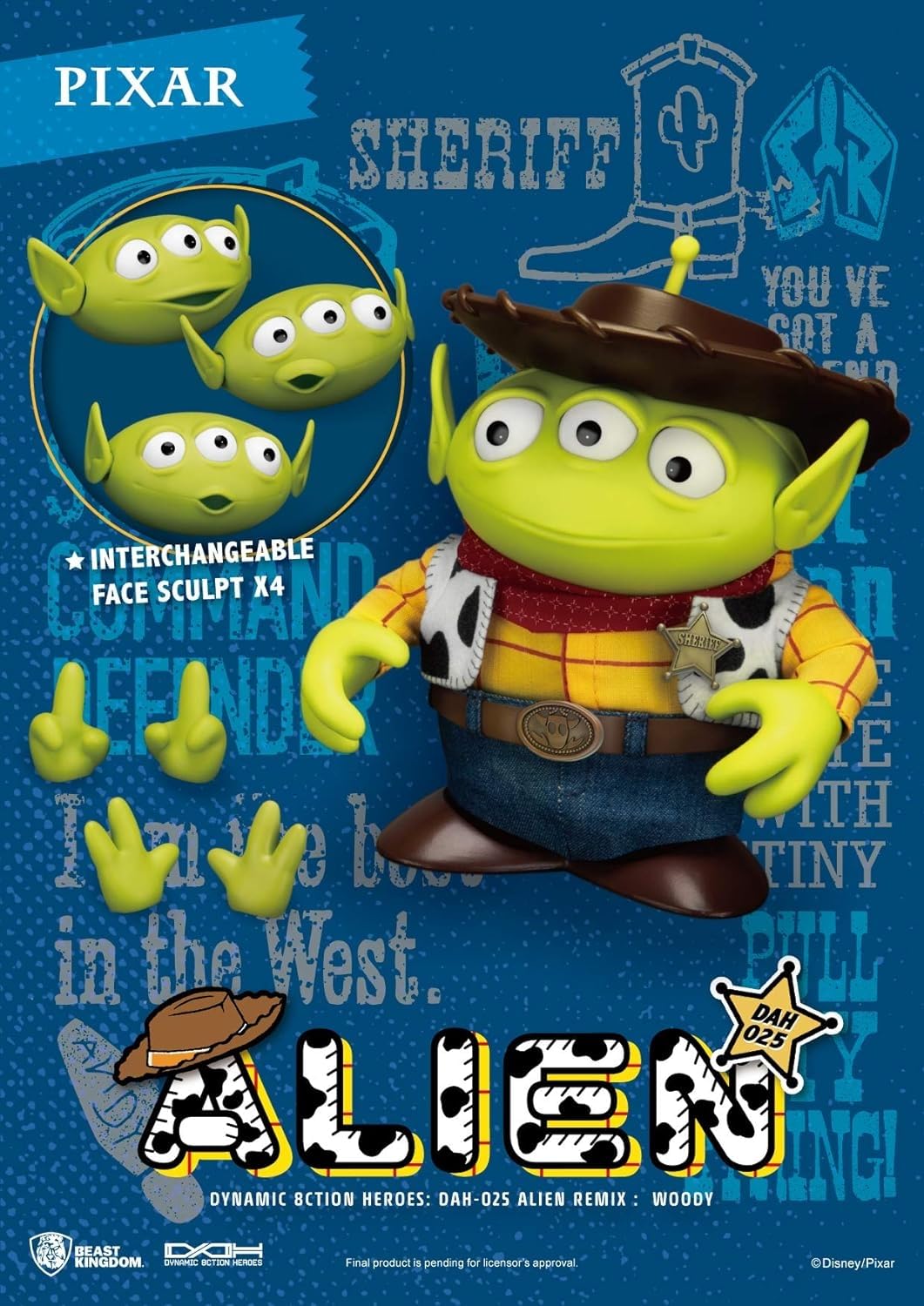 From Beast Kingdom. The naughty Three-Eyed Aliens are back once again with another dress-up remix, now with the costumes from the two famous protagonists of Toy Story! Dressed up as Sheriff Woody, our little Alien friend is seen sporting real fabric for all of his clothing, including the vest, shirt and jeans, making this little troublemaker ready for the wild-west. Each figure includes four types of replaceable Alien head sculpts (normal, open mouthed, grinning and happy) with movable eyes, as well as three pairs of interchangeable hands. With adjustable antennas and Woody's removable hat, collectors can out this figure in an endless amount of poses! Make sure this little rascal is added to your collection today!