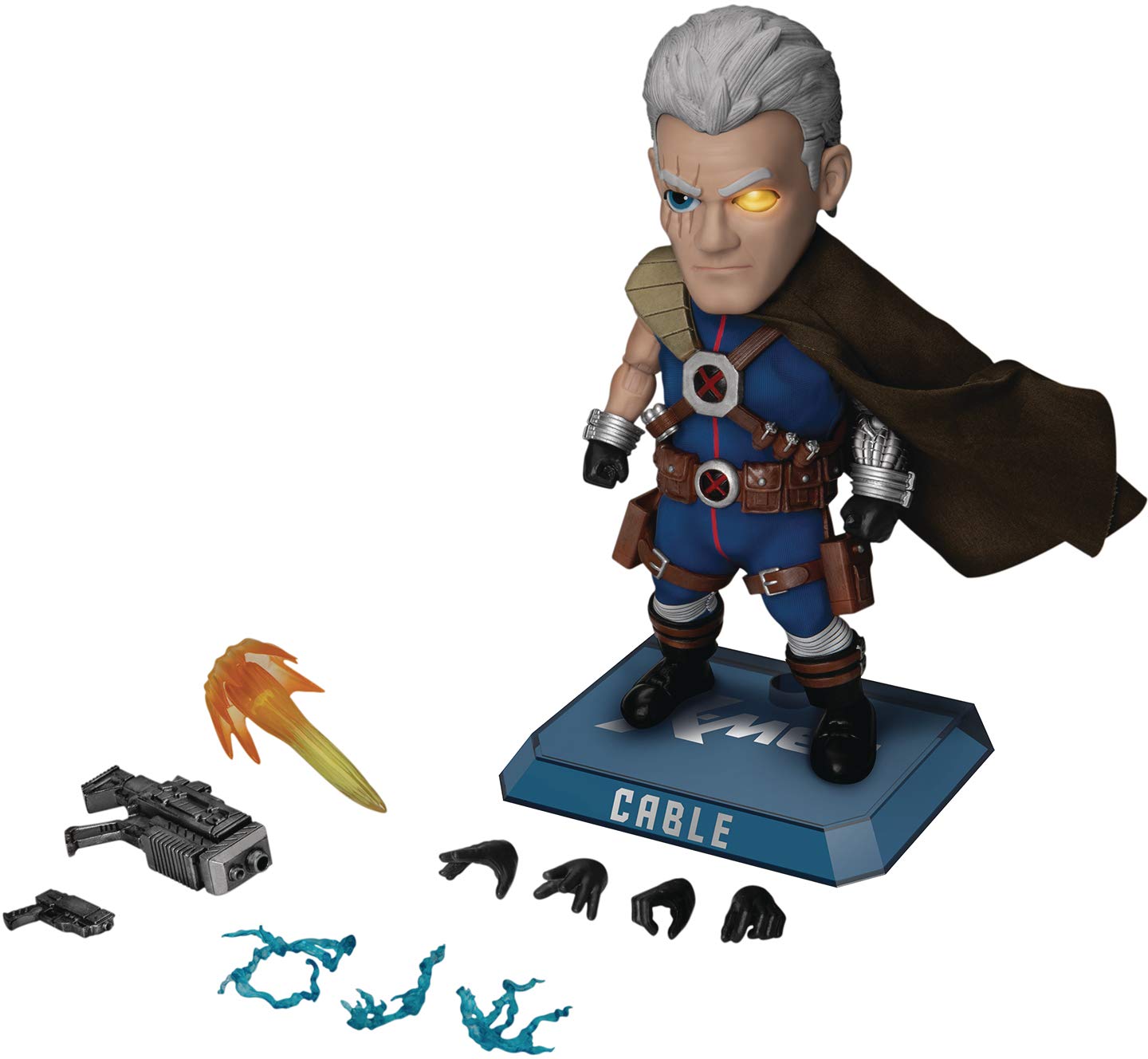 Beast Kingdom introduces the latest EAA (Egg Attack Action) 6-inch highly articulated action figure: Cable! Recreating his famous Earth-616 X-Men costume design in real cloth with the blue body suit, armor and cloak, the EAA Cable is perfect for a time traveling enthusiast! Two detailed head sculpts accurately recreate Cables signature look, with a light-up left eye and mechanized left arm! A selection of his favorite weapons are included: dual pistols with included holster, and a laser rifle and firing effects, so this Cable is always ready for battle. Cables on and off friendship with Deadpool is given a little fun and attention with a specially included baby carrier and baby Nathan Summers for us only with the EAA-065 X-Men Deadpool (sold separately). A selection of time-traveling lightning effects, and a specially designed, branded figure base with bracket tops off this set. So make sure this EAA Cable joins his Deadpool buddy, and time hops across a universe near you today!