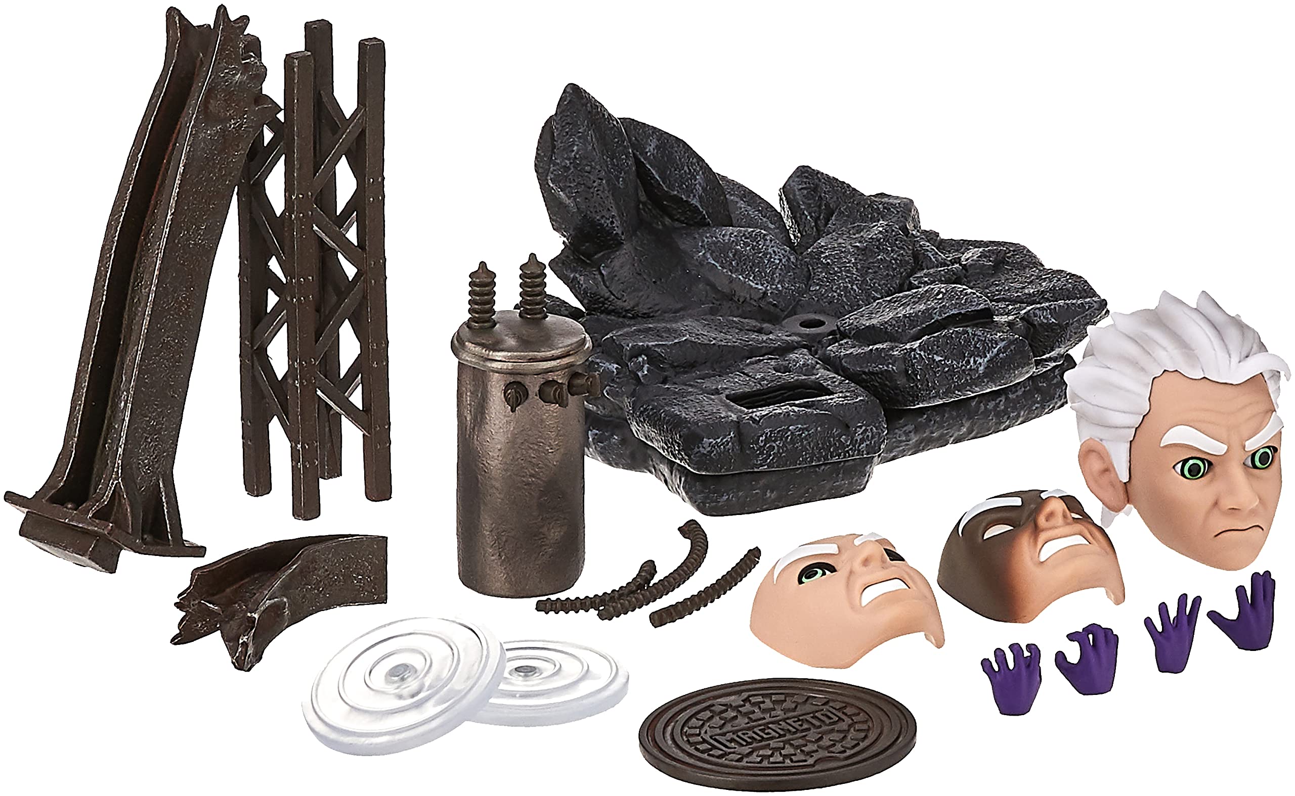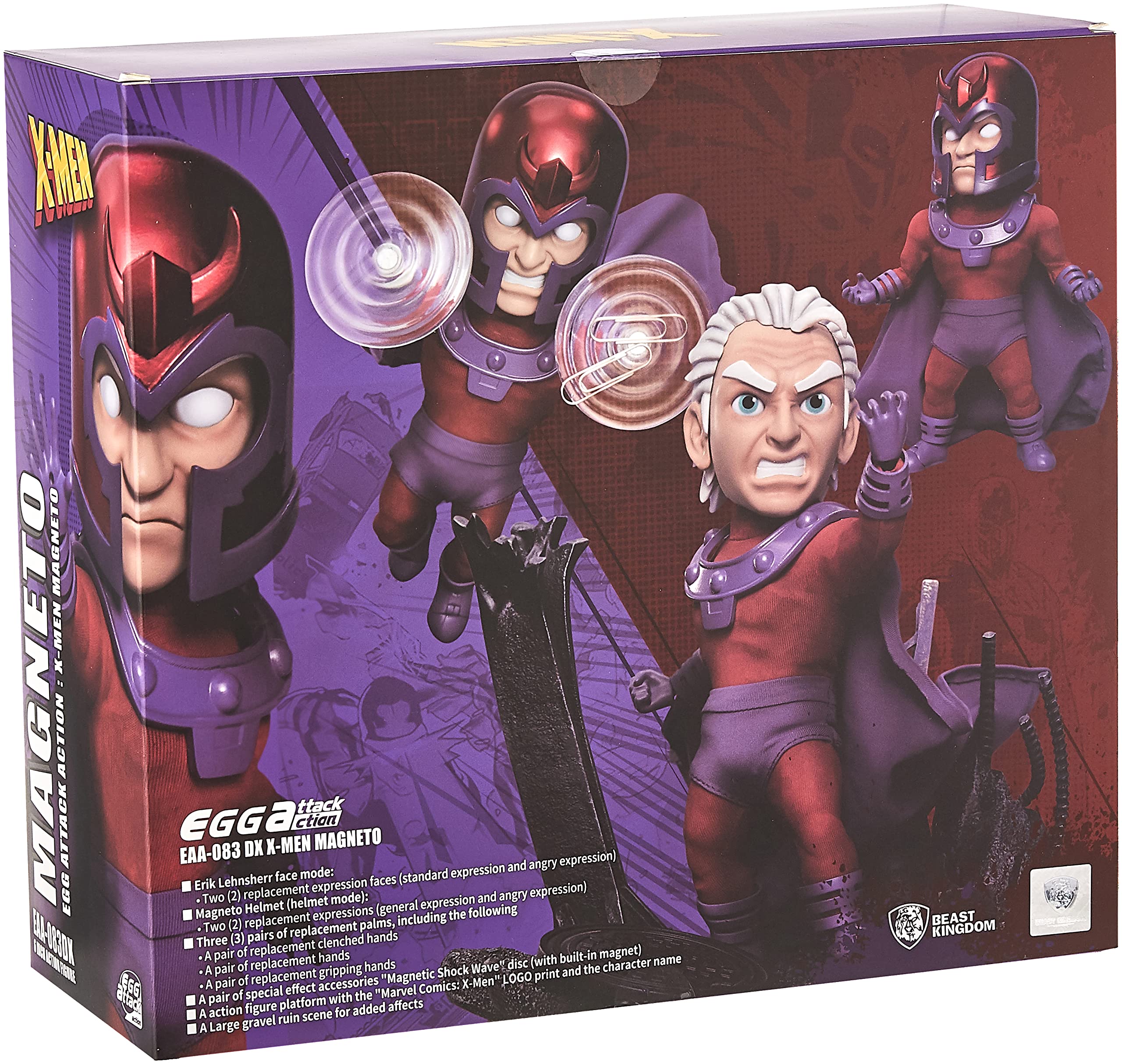 From Beast Kingdom. The Marvel animated series from the 90's introduced fans to some of the most iconic character designs of all time, and now, following the release of the popular egg attack action Wolverine and Cyclops comes arguably their most infamous foe: Magneto! This highly articulated 6" Figure includes a magnetic helmet to protect Magneto from Professor X's Brainwave manipulation. With a focus on detail, The helmet has high Grading paint-work using metallic like effects along with an impressive cloth costume that includes a cloak with adjustable built-in wiring, for the ultimate in possibility! Magneto even comes with effect accessories that include magnets built in for authentic magnetic action! This special deluxe eaa-083dx X-Men Magneto includes two replacement Erik lehnsherr expression faces (standard expression and angry expression), two replacement expressions for his helmeted head, three pairs of replacement hands, a pair of magnetic shock wave special effect accessory discs, a branded base, and a large sculpted gravel ruin scene for ultimate atmosphere! Make sure you add Magneto himself to your X-Men scenes to stage your ultimate 90's Mutant battle today!